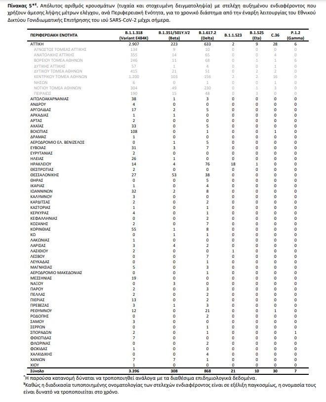 Ολοκληρώθηκε από το Eθνικό Δίκτυο Γονιδιωματικής Επιτήρησης του ιού SARS-CoV-2, που λειτουργεί υπό το συντονισμό του ΕΟΔΥ, η γονιδιωματική ανάλυση σε 856 δείγματα που έχουν επιλεγεί τυχαιοποιημένα ή στοχευμένα και αφορούν στην περίοδο 17 Ιουνίου 2021 έως 12 Ιουλίου 2021 . Από τον έλεγχο των 856 δειγμάτων, αναδείχθηκαν συνολικά 760 δείγματα με στελέχη ειδικού ενδιαφέροντος (Variants Of Concern – VOC) και 69 δείγματα με στελέχη υπό παρακολούθηση (Variants Under Monitoring). Εκ των 760 δειγμάτων με στελέχη ειδικού ενδιαφέροντος, τα 466 αφορούν στο στέλεχος Delta, 200 αφορούν στο Alpha, 93 αφορούν στο Βeta και 1 αφορούν στο Gamma. Εκ των 69 δειγμάτων με στελέχη υπό παρακολούθηση, όλα αφορούν στο στέλεχος B.1.1.318 (Variant E484K) (Πίνακας 3). Από την έναρξη λειτουργίας του Εθνικού Δικτύου Γονιδιωματικής Επιτήρησης του ιού SARS-CoV-2 μέχρι σήμερα έχουν ελεγχθεί στην επικράτεια συνολικά 22.656 δείγματα από εγχώρια κρούσματα. Εξ αυτών 19.323 προέρχονται από τυχαία επιλογή δειγμάτων, 2.572 προέρχονται από στοχευμένη λήψη ή επιλογή δειγμάτων και για 761 δείγματα δεν είναι διαθέσιμος ο τρόπος επιλογής. Μεταξύ των 19.323 τυχαία επιλεγμένων δειγμάτων στην επικράτεια, τα τέσσερα πιο συχνά στελέχη ειδικού ενδιαφέροντος ή υπό παρακολούθηση που έχουν απομονωθεί είναι το Alpha, με ποσοστό 75,60%, ακολουθούμενο από το B.1.1.318 (Variant E484K) με ποσοστό 11,15%, το Delta με ποσοστό 1,55% και το Beta με ποσοστό 0,71% (Πίνακας 4). Η διαχρονική εξέλιξη της σχετικής συχνότητας των αλληλουχηθέντων δειγμάτων από τυχαία δειγματοληψία ανά είδος στελεχών απεικονίζεται στο Διάγραμμα 9 μέχρι και την εβδομάδα 26, ενώ δίνονται επιπλέον προσωρινά στοιχεία για τις εβδομάδες 27-28. Από τα 2.572 δείγματα που έχουν ληφθεί ή επιλεγεί στοχευμένα, έχουν βρεθεί 2.410 στελέχη ειδικού ενδιαφέροντος ή υπό παρακολούθηση. Από τα δείγματα αυτά, 50,19% αφορούν στο B.1.1.318 (Variant E484K), 19,98% στο Delta, 16,49% στο Alpha, 6,80% στο Beta, 0,16% στο C.36 και 0,08% στο Gamma. Επιπλέον, έχουν απομονωθεί συνολικά 171 στελέχη ειδικού ενδιαφέροντος ή υπό παρακολούθηση ή ενδιαφέροντος από δείγματα εισαγόμενων κρουσμάτων, εκ των οποίων 109 αφορούν στο Alpha, 47 στο Delta, 5 στο Beta, 4 στο Β.1.1.318 (Variant E484K), 2 στο B.1.621 (VOI), 1 στο Kappa, 1 στο Eta, 1 στο C.36, 1 στο B.1.623. Όσον αφορά στα στελέχη ενδιαφέροντος που χρήζουν άμεσης λήψης μέτρων ελέγχου επί του παρόντος στη χώρα, η γεωγραφική κατανομή ανά Περιφερειακή Ενότητα παρουσιάζεται στον πίνακα 5.