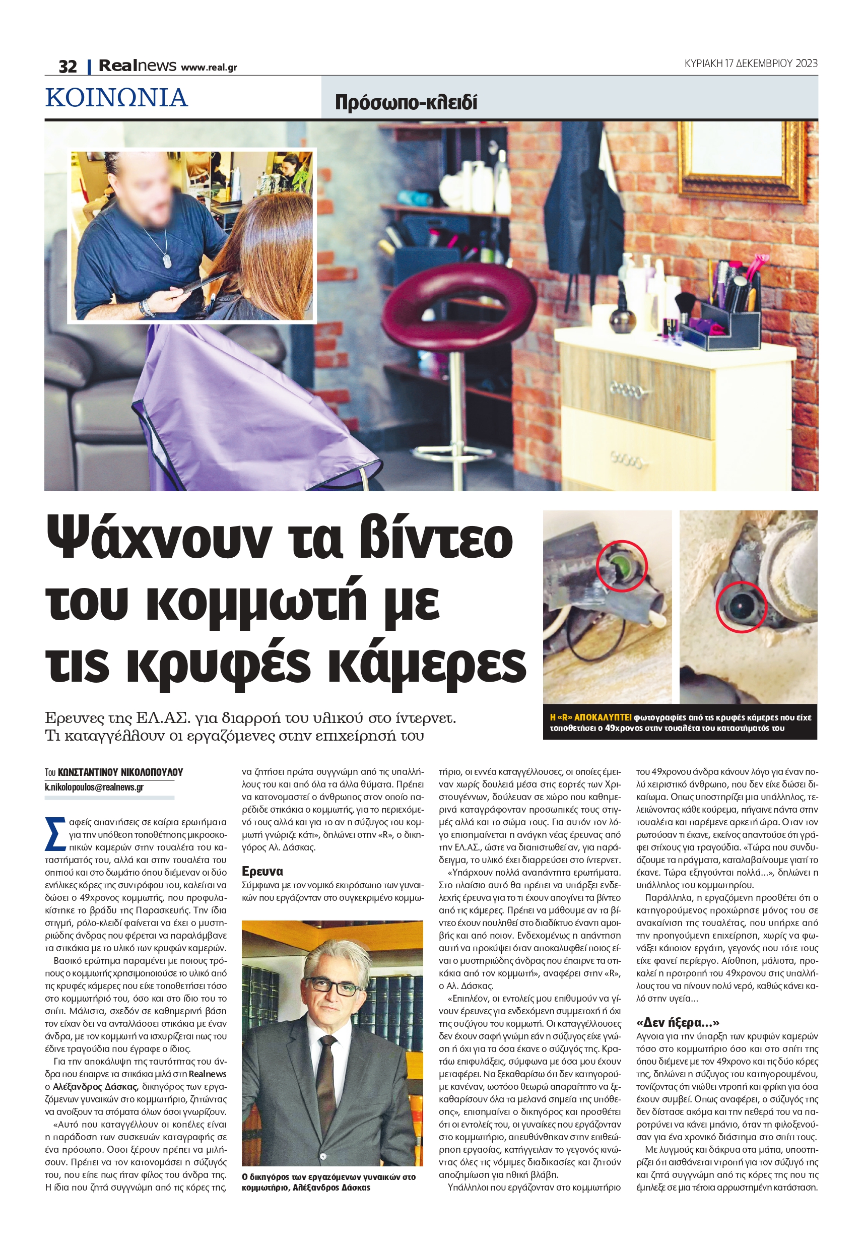 «Αυτό που καταγγέλλουν οι κοπέλες είναι η παράδοση των συσκευών καταγραφής σε ένα πρόσωπο. Οσοι ξέρουν πρέπει να μιλήσουν. Πρέπει να τον κατονομάσει η σύζυγός του, που είπε πως ήταν φίλος του άνδρα της. Η ίδια που ζητά συγγνώμη από τις κόρες της, να ζητήσει πρώτα συγγνώμη από τις υπαλλήλους του και από όλα τα άλλα θύματα. Πρέπει να κατονομαστεί ο άνθρωπος στον οποίο παρέδιδε στικάκια ο κομμωτής, για το περιεχόμενό τους αλλά και για το αν η σύζυγος του κομμωτή γνώριζε κάτι», δηλώνει στην «R», ο δικηγόρος Αλ. Δάσκας.