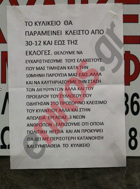 Χωρίς καφενείο μπήκε ο Φεβρουάριος για τους εργαζόμενους στο Υπουργείο Εργασίας…Το κυλικείο στον ημιώροφο του κτιρίου στην οδό Σταδίου 29 παραμένει κλειστό για τρίτη ημέρα και απ’ότι φαίνεται το “λουκέτο” είναι οριστικό, τουλάχιστον μέχρι..τις εκλογές.Η ταμπέλα που μέχρι πριν λίγες ημέρες ενημέρωνε τον κόσμο για το πού βρίσκεται το κυλικείο εντός του κτιρίου είναι πλεόν δυσδιάκριτη. Κι αυτό γιατί καλύπτεται από την ανακοίνωση που έχει τοιχοκολληθεί από τους ιδιοκτήτες του κυλικείου. Μια ανακοίνωση με σαφές μήνυμα: “Το κυλικείο θα παραμείνει κλειστό από 30-12 και έως τις εκλογές”.”Ελπίζουμε η όποια πολιτική ηγεσία και αν προκύψει θα δει με περισσότερη κατανόηση και συμπάθεια το κυλικείο”, αναφέρεται επίσης στο τέλος της ανακοίνωσης.Στην ανακοίνωσή τους οι ιδιοκτήτες ευχαριστούν όσους ελάχιστους τους τίμησαν κατά τη δεκάμηνη παρουσιά τους στο χώρο, όμως καυτηριάζουν τη στάση των διευθυντών και του προέδρου του συλλόγου που “με τη στάση τους οδήγησαν στο προσωρινό κλείσιμο του κυλικείου αλλά και στην απώλεια εργασίας τριών νέων ανθρώπων”.