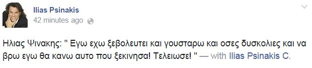“Εγώ έχω ξεβολευτεί και γουστάρω και όσες δυσκολίες και να βρω εγώ θα κάνω αυτό που ξεκίνησα! Τελείωσε!” έγραψε στο λογαριασμό του στο facebook ο δήμαρχος Μαραθώνα, Ηλίας Ψινάκης, στέλνοντας μήνυμα προς πάσα κατεύθυνση.