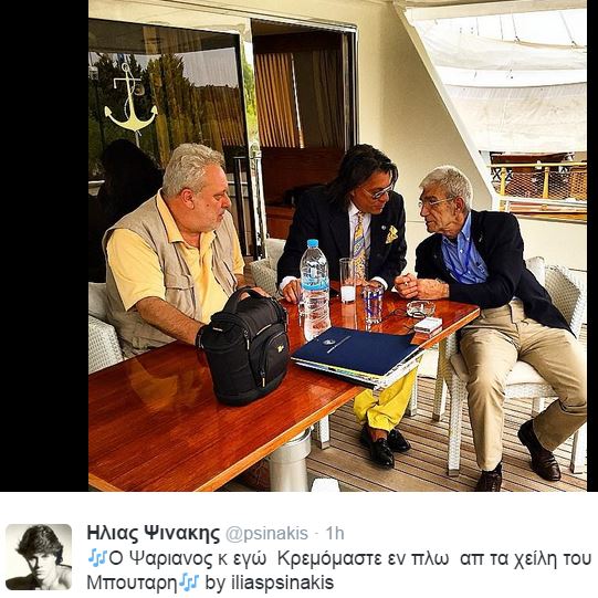 Ο δήμαρχος Μαραθώνα ανέβασε στο λογαριασμό του στο Twitter την παρακάτω φωτογραφία γράφοντας: “Ο Ψαριανός κι εγώ κρεμόμαστε εν πλω απ’ τα χείλη του Μπουτάρη”.