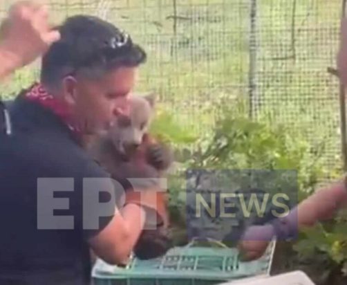 Ο ιδιοκτήτης με τη βοήθεια γειτόνων κατόρθωσε να παγιδέψει το αρκουδάκι σε ένα πλαστικό τελάρο.