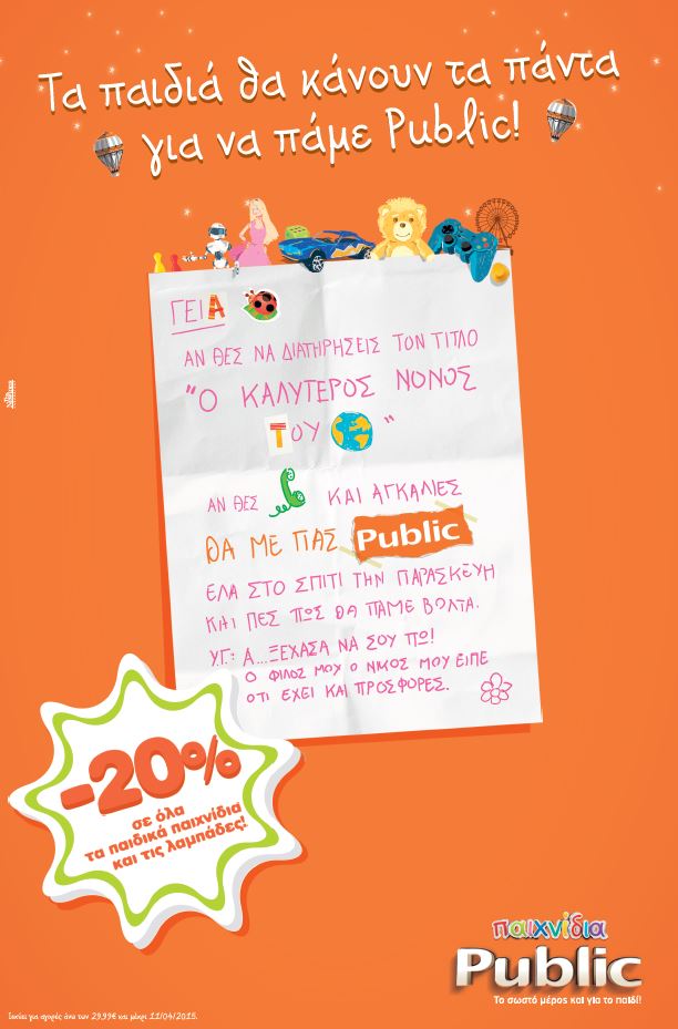 Και μην ξεχνάς! Για λίγες μόνο ημέρες* στα Public απολαμβάνεις έκπτωση -20% σε όλα τα παιδικά παιχνίδια και τις λαμπάδες με αγορές άνω των 29,99€!