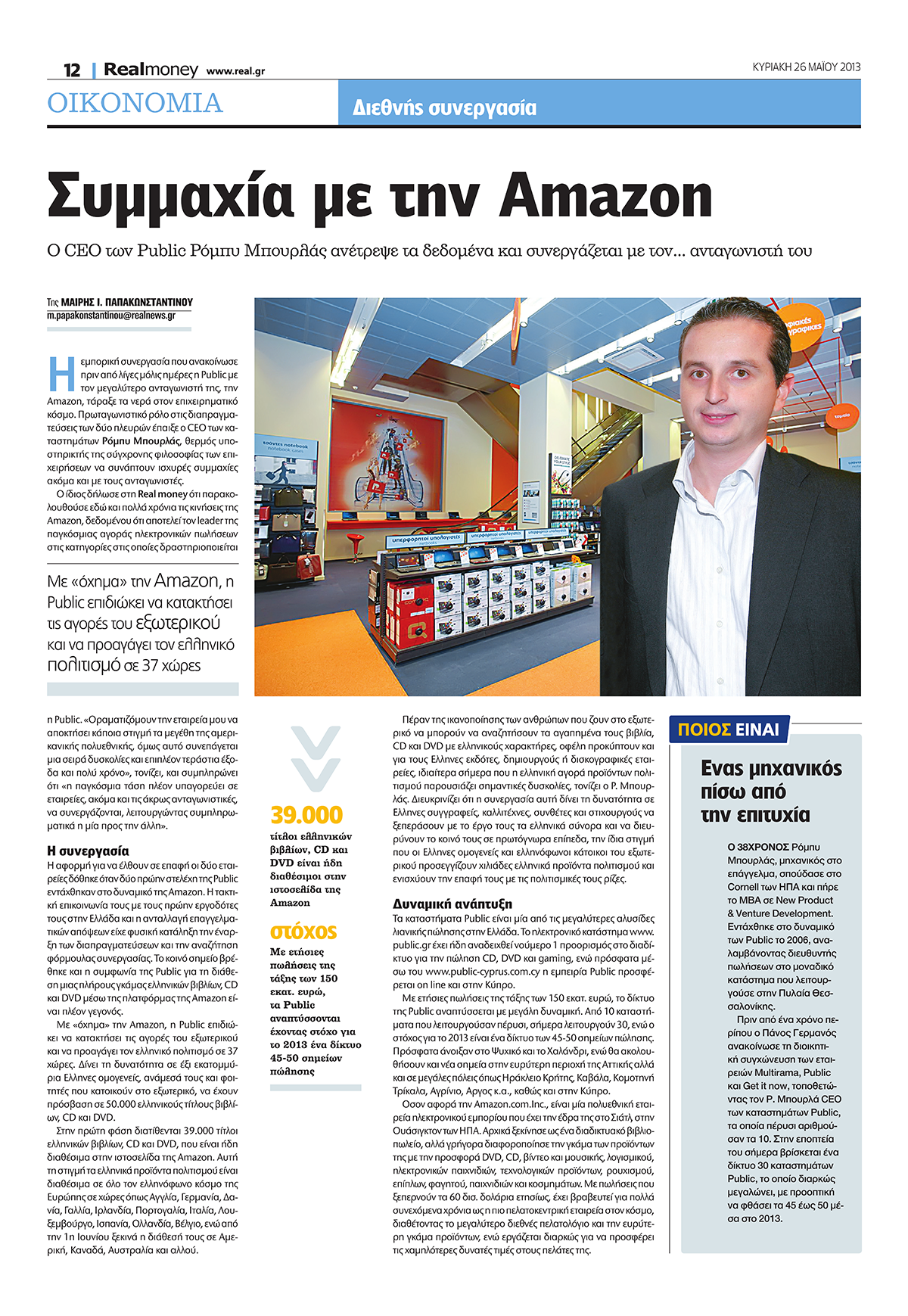 Ο ίδιος δήλωσε στη Real money ότι παρακολουθούσε εδώ και πολλά χρόνια τις κινήσεις της Amazon, δεδομένου ότι αποτελεί τον leader της παγκόσμιας αγοράς ηλεκτρονικών πωλήσεων στις κατηγορίες στις οποίες δραστηριοποιείται η Public. «Οραματιζόμουν την εταιρεία μου να αποκτήσει κάποια στιγμή τα μεγέθη της αμερικανικής πολυεθνικής, όμως αυτό συνεπάγεται μια σειρά δυσκολίες και επιπλέον τεράστια έξοδα και πολύ χρόνο», τονίζει, και συμπληρώνει ότι «η παγκόσμια τάση πλέον υπαγορεύει σε εταιρείες, ακόμα και τις άκρως ανταγωνιστικές, να συνεργάζονται, λειτουργώντας συμπληρωματικά η μία προς την άλλη».