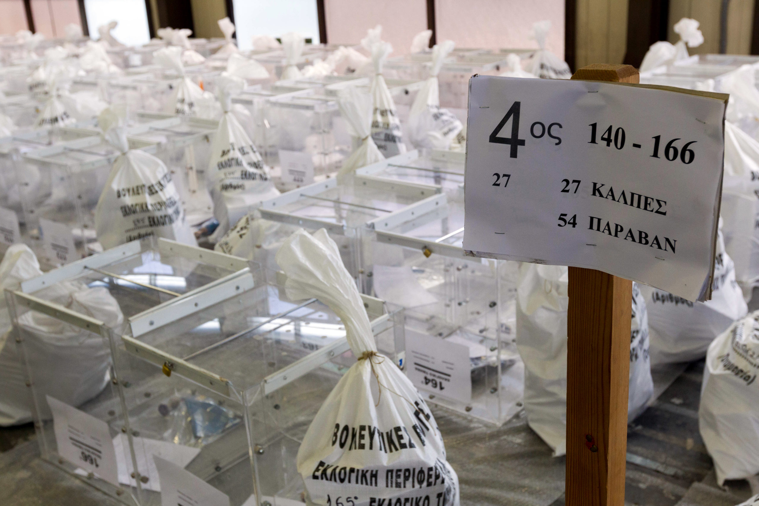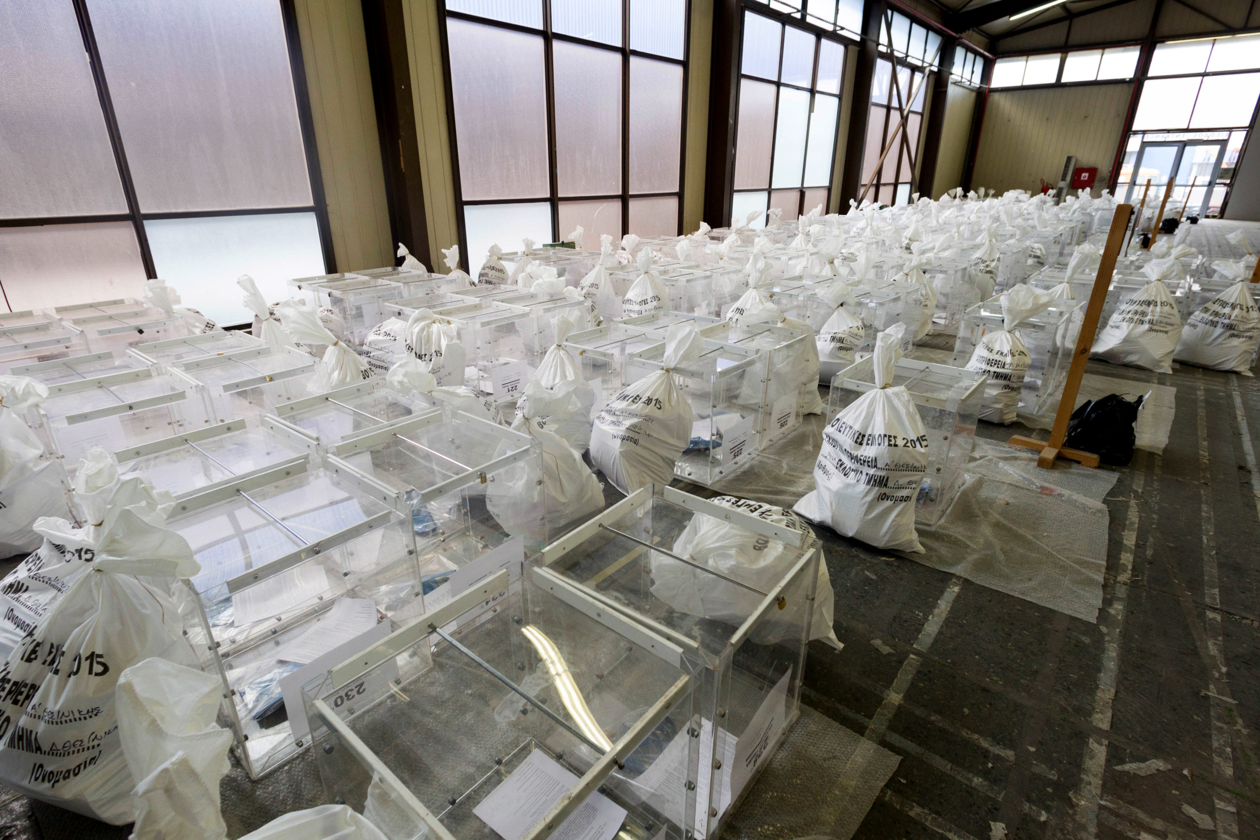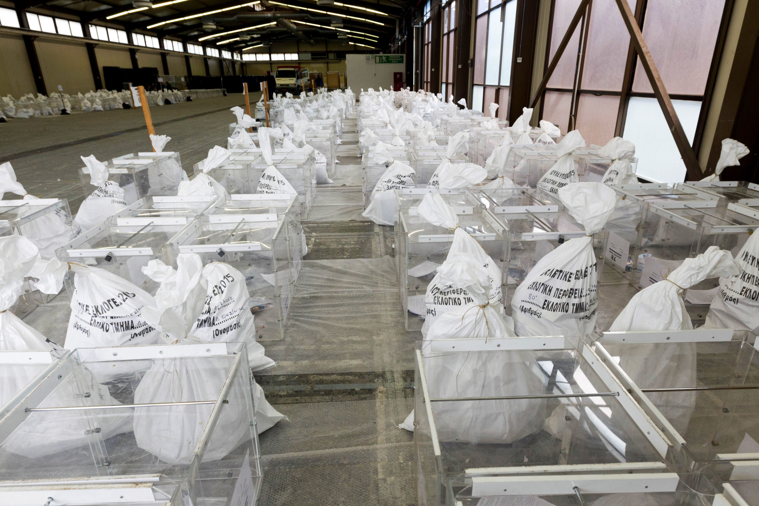 Στις φωτογραφίες απεικονίζονται οι 424 κάλπες και οι 424 σάκοι με το εκλογικό υλικό που θα διατεθεί, καθώς και τα 848 παραβάν που θα παραδοθούν την Παρασκευή και το Σάββατο στα εκλογικά κέντρα.