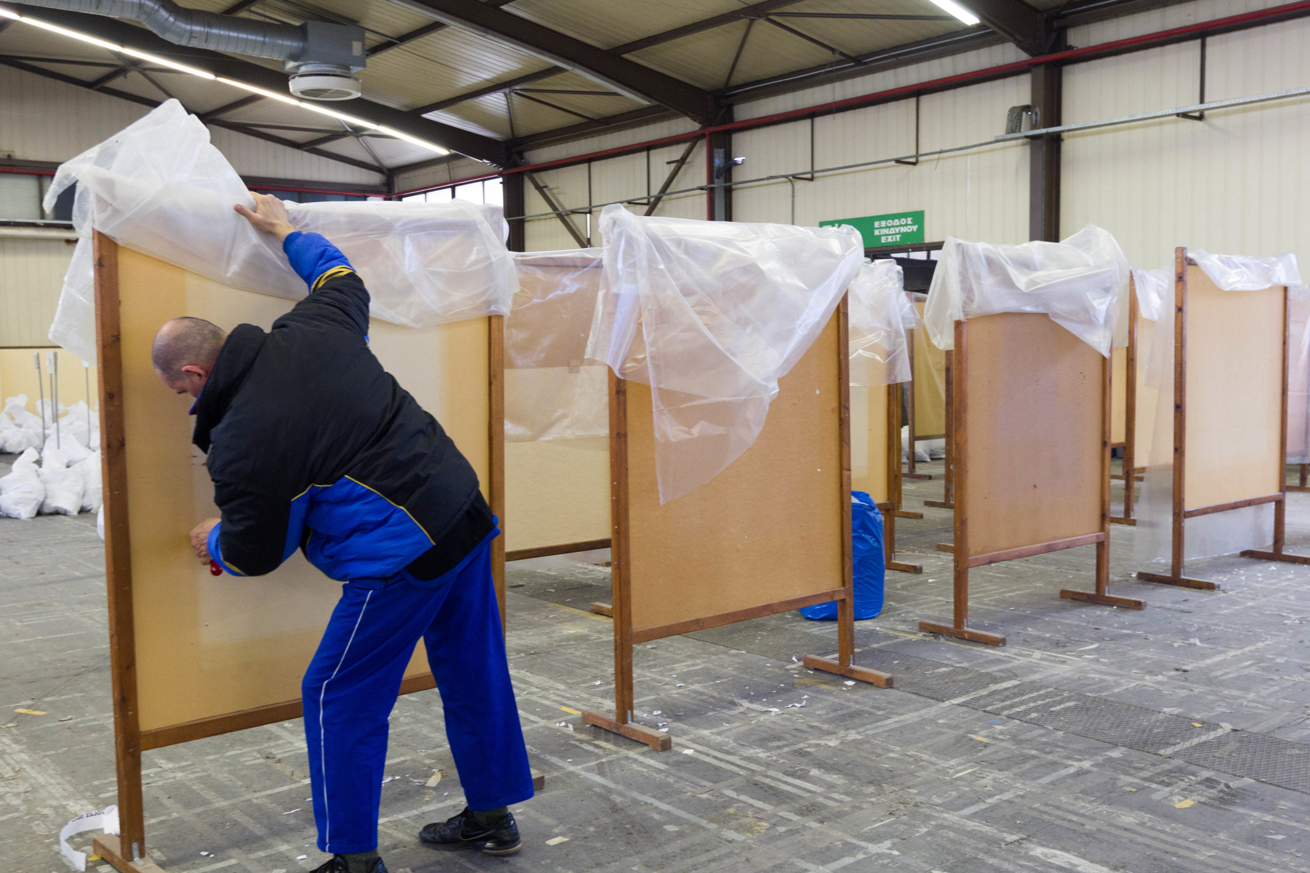 Εκατοντάδες κάλπες, παραβάν και εκατομμύρια ψηφοδέλτια συγκεντρώθηκαν από τους υπαλλήλους του δήμου Θεσσαλονίκης στο περίπτερο 4 της Διεθνούς Έκθεσης Θεσσαλονίκης.