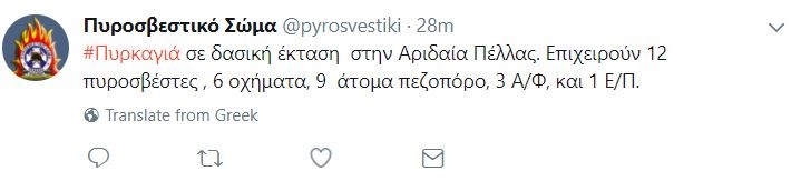 Πυρκαγιά ξέσπασε πριν από λίγο σε δασική έκταση στην Αριδαία Πέλλας.
