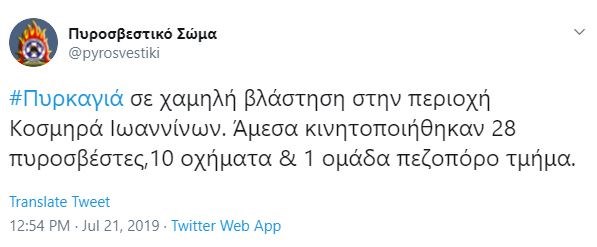 Πυρκαγιά ξέσπασε σε χαμηλή βλάστηση στην περιοχή Κοσμήρα Ιωαννίνων.