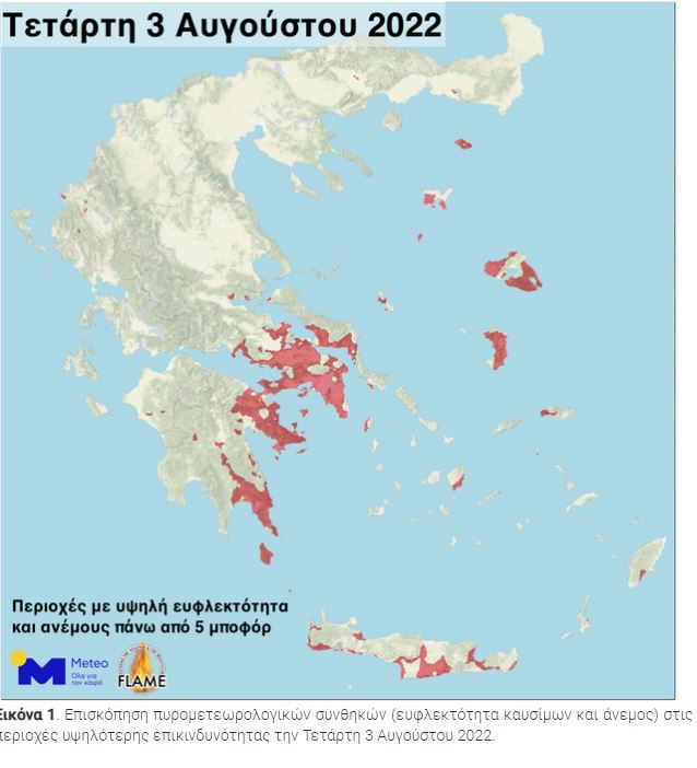 Αναλυτικά, με βάση τα τελευταία διαθέσιμα προγνωστικά στοιχεία που ανέλυσε η πυρομετεωρολογική ομάδα FLAME του Εθνικού Αστεροσκοπείου Αθηνών (ΕΑΑ)/meteo.gr, σήμερα, Τετάρτη 3 Αυγούστου, αναμένεται: