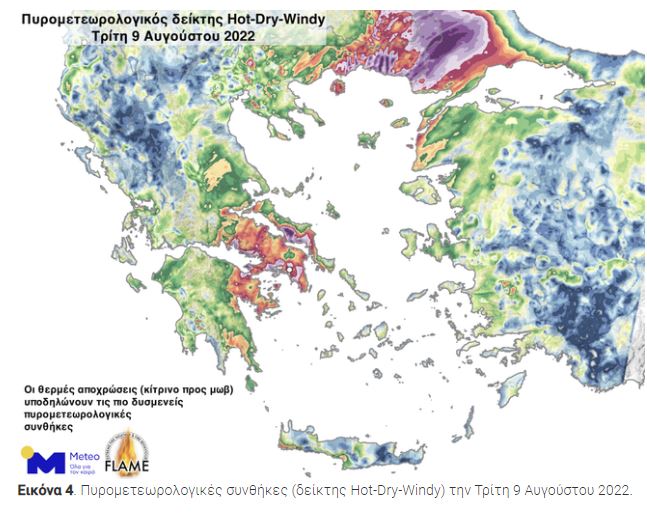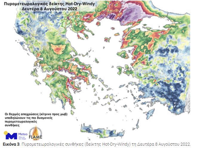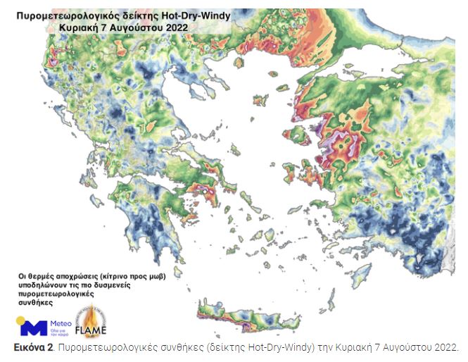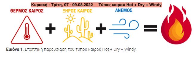 Συνολικά, οι πυρομετεωρολογικές συνθήκες κατά το διάστημα Κυριακή – Τρίτη , 07 – 09.08.2022 αναμένεται να χαρακτηριστούν από τον ιδιαίτερα επικίνδυνο για δασικές πυρκαγιές τύπο καιρού Hot + Dry + Windy (Εικόνα 1).