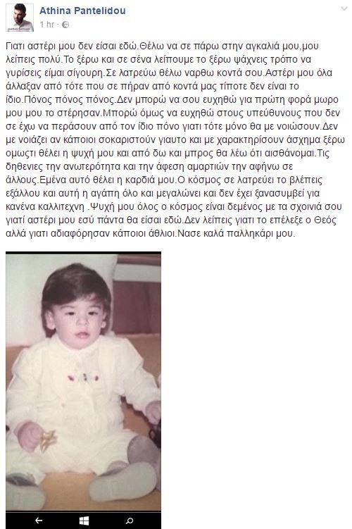 Ένα συγκλονιστικό μήνυμα ανήρτησε στον λογαριασμό της η μητέρα του Παντελή Παντελίδη, Αθηνά, καθώς σαν σήμερα πριν από 33 χρόνια είχε γεννηθεί ο τραγουδιστής.
