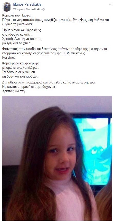 Με τα ερωτήματα να παραμένουν αναπάντητα ο πατέρας της Μελίνας πήγε την Κυριακή του Πάσχα στο νεκροταφείο για να πάει το Άγιο Φως στο μνήμα της κόρης του.