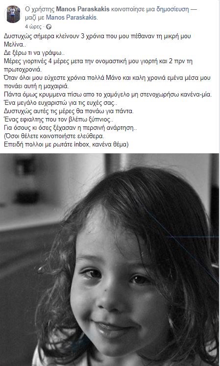 Μία συγκινητική ανάρτηση στον προσωπικό του λογαριασμό στο Facebook έκανε ο πατέρας της μικρής Μελίνας, για τη συμπλήρωση των τριών χρόνων από τον θάνατό της.