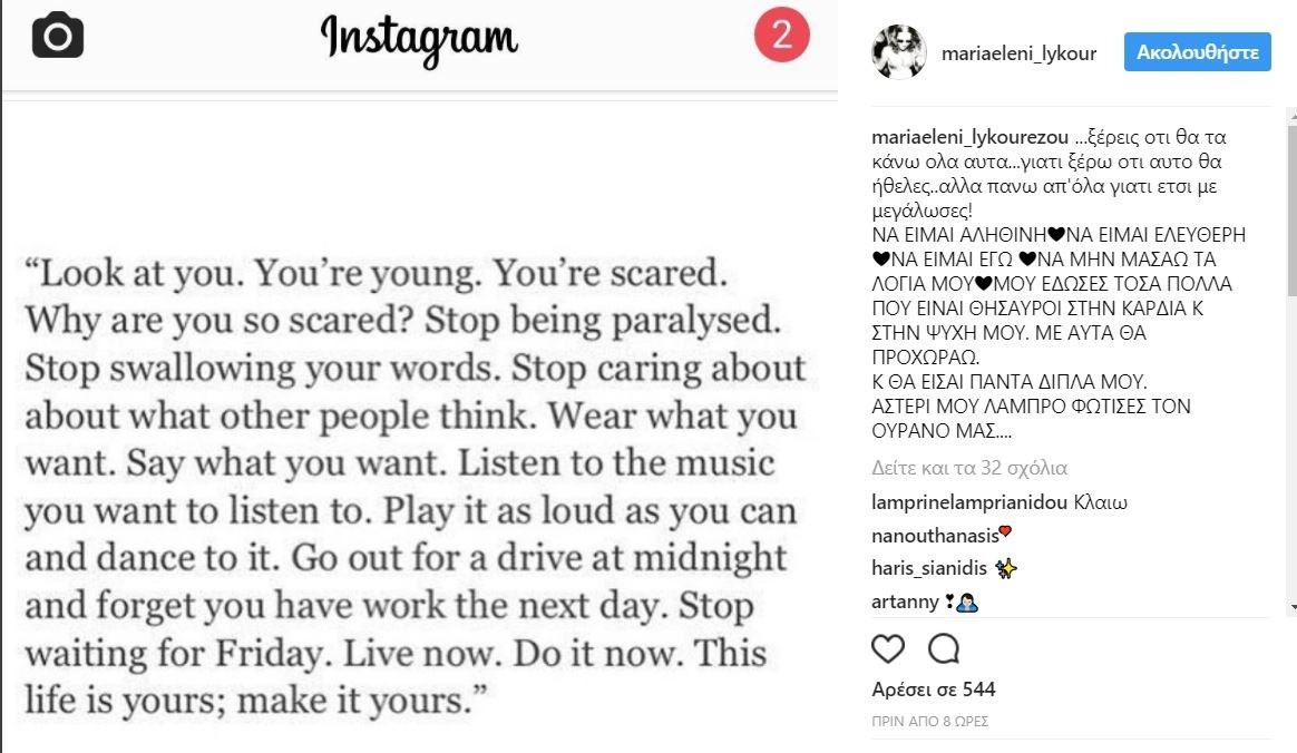Η Μαρία-Ελένη Λυκουρέζου συνόδευσε τη φωτογραφία με το σχόλιο: “…ξέρεις ότι θα τα κάνω όλα αυτά…γιατί ξέρω ότι αυτό θα ήθελες..αλλά πάνω από όλα γιατί έτσι με μεγάλωσες! Να είμαι αληθινή. Να είμαι ελεύθερη. Να είμαι εγώ. Να μην μασάω τα λόγια μου. Μου έδωσες τόσα πολλά που είναι θησαυροί στην καρδιά και στην ψυχή μου. Με αυτά θα προχωράω. Και θα είσαι πάντα δίπλα μου. Αστέρι μου λαμπρό φώτισες τον ουρανό μας…”