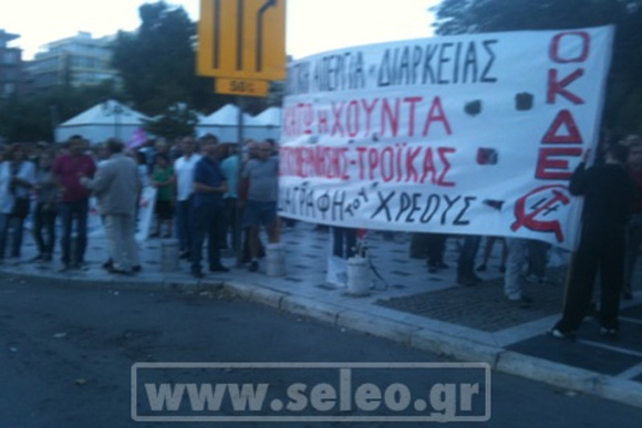 «Ανεπιθύμητη η Μerkel» και «Εμείς δεν κλέψαμε, δουλέψαμε» γράφουν κάποια από τα πανό που κρατάνε οι διαδηλωτές, οι οποίοι συγκέντρωθηκαν στο άγαλμα του Βενιζέλου στη Θεσσαλονίκη, ανταποκρινόμενοι στο κάλεσμα της ΓΣΣΕ και της ΑΔΕΔΥ…