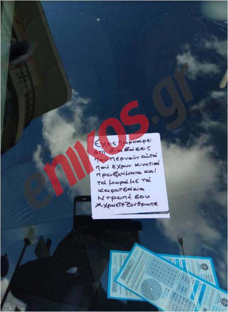 Το “δωράκι” δεν ήταν άλλο από ένα σημείωμα, το οποίο του άφησε κάποιος αγανακτισμένος πολίτης στο παρμπρίζ. “Έχεις παρκάρει στις διαβάσεις που περνούν αυτοί που έχουν κινητικά προβλήματα και τα μωρά με τα καροτσάκια. Ντροπή σου Άχρηστε άνθρωπε”, είναι το μήνυμα που αναγραφόταν στο… ραβασάκι.