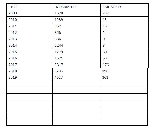 Δείτε τον πίνακα με τα επίσημα στοιχεία των παραβιάσεων και των εμπλοκών, όπως αυτά καταγράφονται από το 2009 έως και το 2019, σύμφωνα με τις καταγραφές και της Παρασκευής, 20 Δεκεμβρίου.