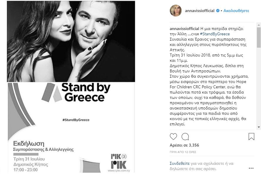 Η Άννα Βίσση και ο Αντώνης Ρέμος πραγματοποιούν συναυλία και έρανο για συμπαράσταση και αλληλεγγύη στους πυρόπληκτους της Αττικής, την Τρίτη 31 Ιουλίου στη Λευκωσία.