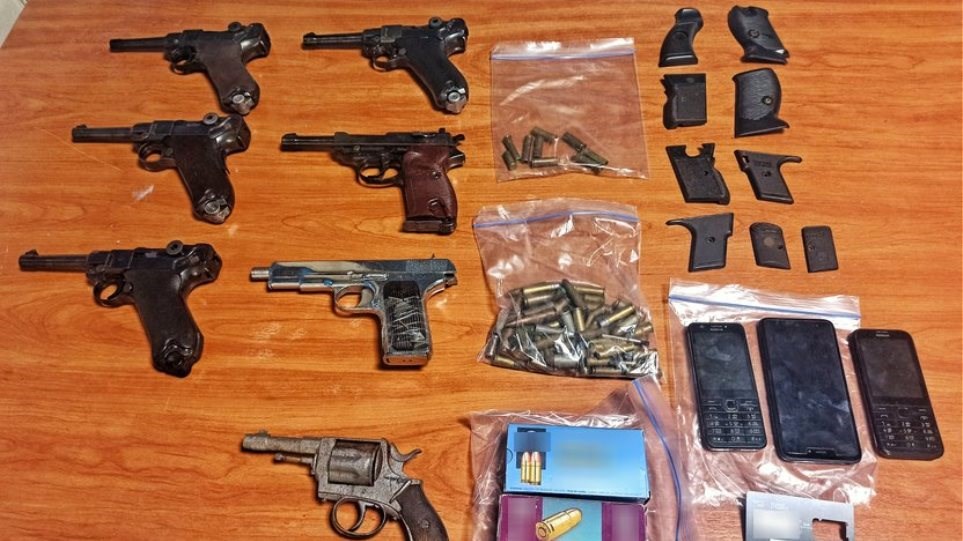 Σε δεύτερο χρόνο, αστυνομικοί διενήργησαν έρευνες στις οικίες και σε επιχείρηση και των λοιπών συλληφθέντων, κατά την διάρκεια των οποίων βρέθηκαν επιπλέον και κατασχέθηκαν συνολικά, το χρηματικό ποσό των 6.230 ευρώ, 6 πιστόλια, περίστροφο, κοντάκι πολεμικού τυφεκίου, 9 μέρη λαβής πιστολιού, 2 λαβές πιστολιού, εξαρτήματα πολεμικού τυφεκίου και κυνηγετικού όπλου, θήκη πιστολιού, σπρέι πιπεριού, 152 φυσίγγια διαφόρων τύπων και διαμετρημάτων, μαχαίρι, καθαριστικά οπλισμού, ουσίες νόθευσης ναρκωτικών ουσιών, συσκευασίες για τον διαχωρισμό δόσεων ναρκωτικών ουσιών, κάλυκες, πλήθος συσκευών κινητής τηλεφωνίας”.