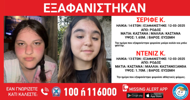 Τα ίχνη της 14χρονης Σεριφέ Κ. και της 13χρονης Ντενίζ Κ. χάθηκαν το πρωί της Τετάρτης 12 Μαρτίου 2025. Το «Χαμόγελο του Παιδιού» ενημερώθηκε σήμερα, 13/03/2025 και προχώρησε σε δημοσιοποίηση των στοιχείων των ανηλίκων κατόπιν εισαγγελικής εντολής.
