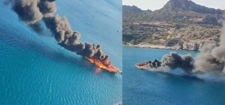 Συγκλονιστικές είναι οι εικόνες από το σκάφος που τυλίχτηκε στις φλόγες στη μέση της θάλασσας, στη Ρόδο, στις 29 Ιουνίου. Σε βίντεο από ελικόπτερο έχει καταγραφεί το ημερόπλοιο «Μαγγελάνος» να καίγεται ολοσχερώς, ενώ βρίσκεται σε απόσταση περίπου 300 μέτρων από την ακτή στην παραλία Στεγνών, στον Αρχάγγελλο, και οι εικόνες από ψηλά μαρτυρούν το πόσο αστραπιαία εξαπλώθηκε η φωτιά στο ξύλινο ημερόπλοιο.