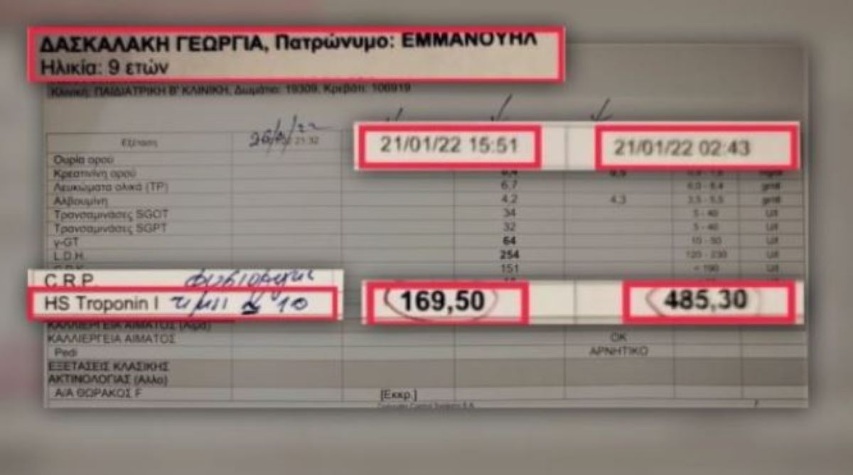 Σύμφωνα με την εκπομπή LiveNews, το εν λόγω έγγραφο αφορά εξετάσεις της 9χρονης Τζωρτζίνας στην παιδιατρική κλινική στο νοσοκομείο της Πάτρας, δηλαδή πριν το κοριτσάκι μεταφερθεί στο «Αγλαΐα Κυριακού» στην Αθήνα και αφήσει την τελευταία του πνοή στα τέλη του Ιανουαρίου του 2022.