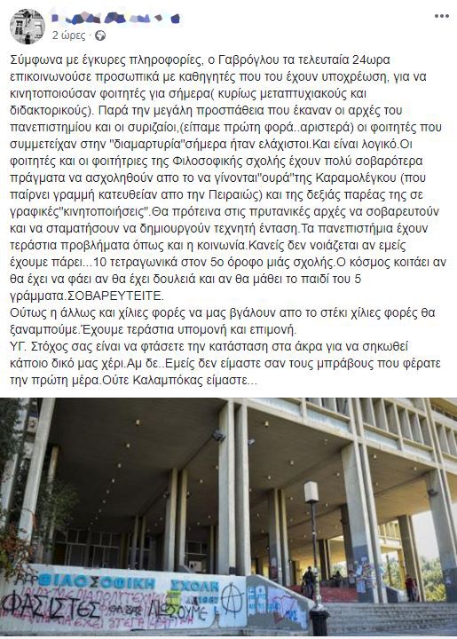 Αναφέρει επιπλέον ότι «τα πανεπιστήμια έχουν τεράστια προβλήματα όπως και η κοινωνία. Κανείς δεν νοιάζεται αν εμείς έχουμε πάρει… 10 τετραγωνικά στον 5ο όροφο μιας σχολής».Δείτε την ανάρτηση:
