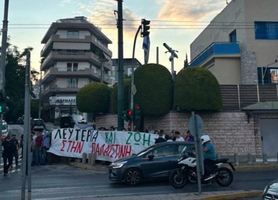Μέλη του Ρουβίκωνα συγκεντρώθηκαν το απόγευμα της Κυριακής (1/6) έξω από την πρεσβεία του Ισραήλ στην Κατεχάκη, άνοιξαν πανό υπέρ της Παλαιστίνης και πέταξαν τρικάκια.