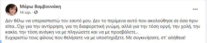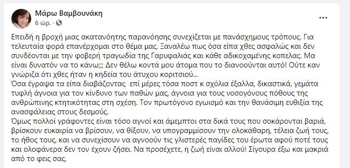 Όπως συγκεκριμένα έγραψε σ’ αυτήν την ανάρτηση η Μάρω Βαμβουνάκη: “Επειδή η βροχή μιας ακατανόητης παρανόησης συνεχίζεται με πανάσχημους τρόπους. Για τελευταία φορά επανέρχομαι στο θέμα μας. Ξαναλέω πως όσα είπα χθες ασφαλώς και δεν συνδέονται με την φοβερή τραγωδία της Γαρυφαλιάς και κάθε αδικοχαμένης κοπελας. Μα είναι δυνατόν να το κάνω;;; Δεν θέλω κοντά μου άτομα που το διανοούνται αυτό! Ούτε καν γνώριζα ότι χθες ήταν η κηδεία του άτυχου κοριτσιού…