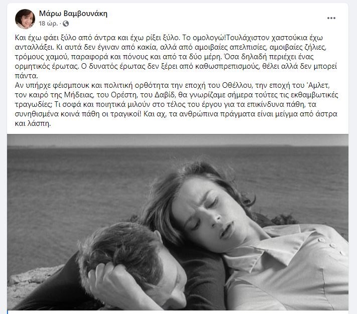 Συγκεκριμένα η κυρία Βαμβουνάκη έγραψε: “Και έχω φάει ξύλο από άντρα και έχω ρίξει ξύλο. Το ομολογώ!Τουλάχιστον χαστούκια έχω ανταλλάξει. Κι αυτά δεν έγιναν από κακία, αλλά από αμοιβαίες απελπισίες, αμοιβαίες ζήλιες, τρόμους χαμού, παραφορά και πόνους και από τα δύο μέρη. Όσα δηλαδή περιέχει ένας ορμητικός έρωτας. Ο δυνατός έρωτας δεν ξέρει από καθωσπρεπισμούς, θέλει αλλά δεν μπορεί πάντα.