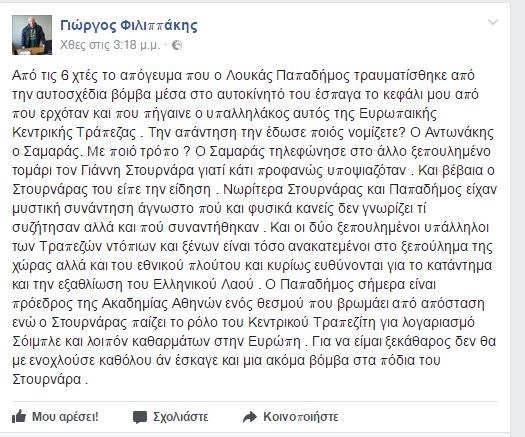 Σάλος έχει δημιουργηθεί με ανάρτηση που έκανε στο Facebook ο Ειδικός Γραμματέας της ΕΣΗΕΑ Γιώργος Φιλιππάκης μια μέρα μετά την επίθεση κατά του πρώην πρωθυπουργού Λουκά Παπαδήμου.
