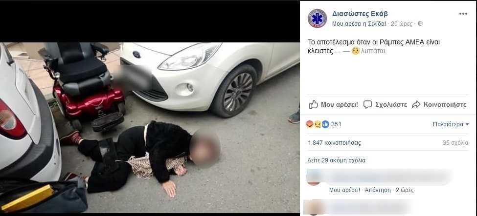 Διασώστες του ΕΚΑΒ ανέβασαν στο λογαριασμό τους στο Facebook μια εικόνα «γροθιά στο στομάχι». Σε αυτή πρωταγωνιστεί μια ηλικιωμένη γυναίκα ΑμεΑ η οποία προσπάθησε να κατέβει από το πεζοδρόμιο στο δρόμο χρησιμοποιώντας την ειδική ράμπα.