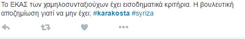 “Φωτιά” έχει πάρει το Twitter με αφορμή τη δήλωση που έκανε την Τετάρτη, η βουλευτής του ΣΥΡΙΖΑ, Εύη Καρακώστα, ότι η κυβέρνηση δεν κόβει γενικά το ΕΚΑΣ, αλλά το κόβει σε αυτούς που δεν το δικαιούνται.
