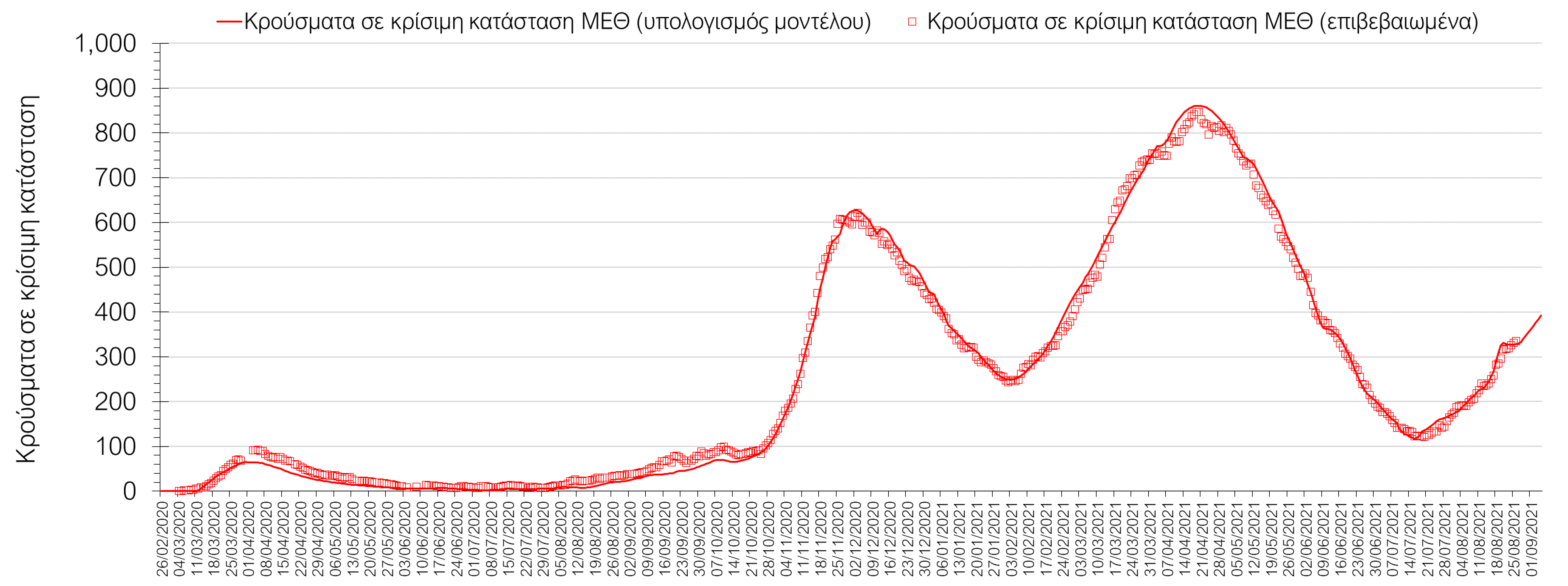 Σχήμα 1. Αριθμός κρουσμάτων σε κρίσιμη κατάσταση (ΜΕΘ) σύμφωνα με τα στοιχεία του ΕΟΔΥ και τις προβλέψεις της υπολογιστικής πλατφόρμας CORE.