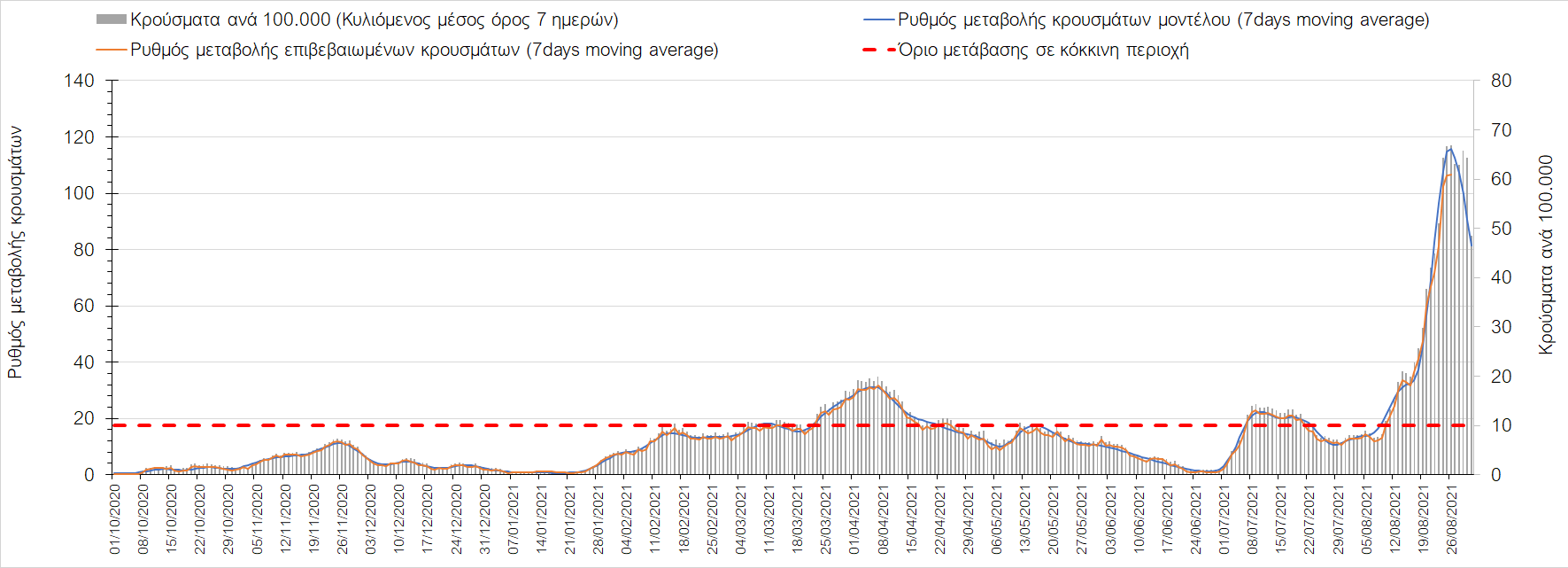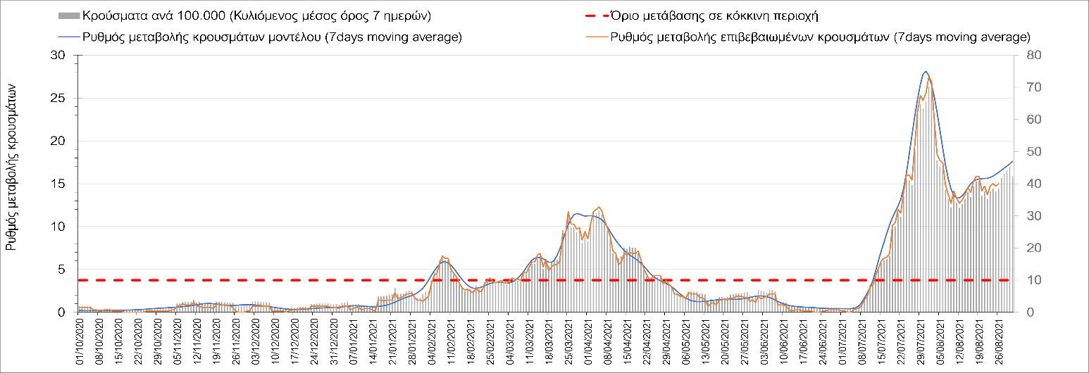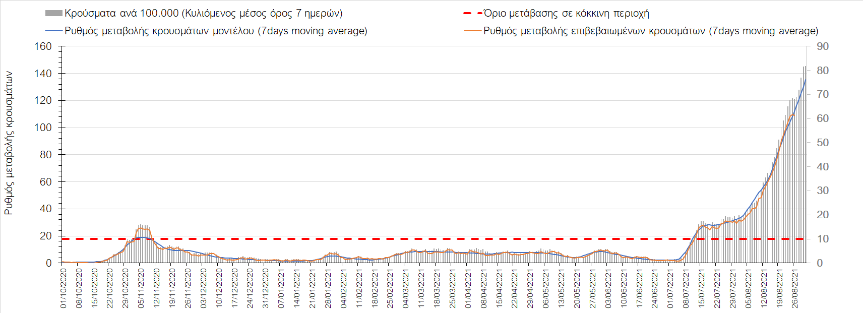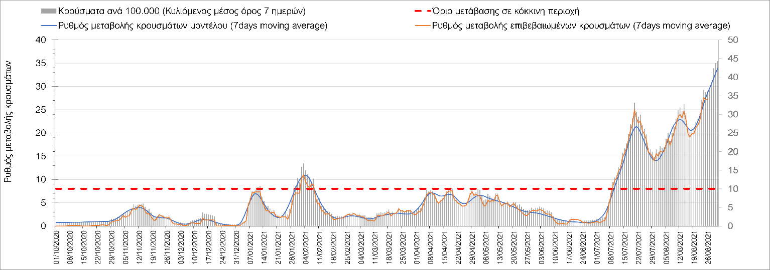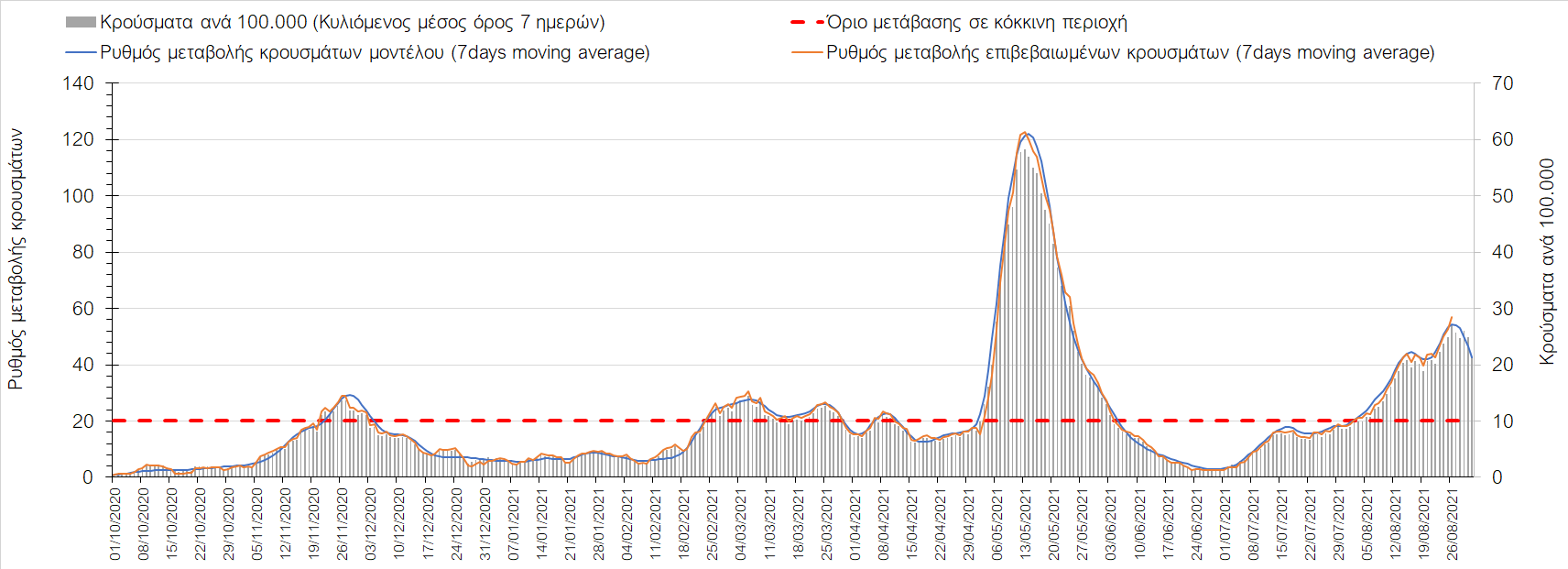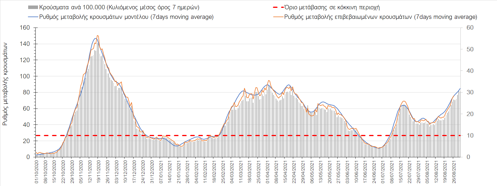 Από την αρχή του Ιουλίου παρατηρείται μια αύξηση του αριθμού των κρουσμάτων στην Αθήνα, η οποία δεν συνάδει ούτε με τη διαμόρφωση της μεταδοτικότητας από τη θερμοκρασία, αλλά ούτε και με τα υπάρχοντα μέτρα, και η οποία την έχει φέρει πέρα από το όριο της περιοχής ανησυχίας. Μια πιθανή εξήγηση είναι η αυξημένη διασπορά στην κοινότητα των μεταλλαγμένων στελεχών Β.1.1.318 και Β.1.167, οπότε και αναμένουμε τα δεδομένα των επομένων ημερών για να μπορέσουμε να διαμορφώσουμε μια πιο σαφή εικόνα.