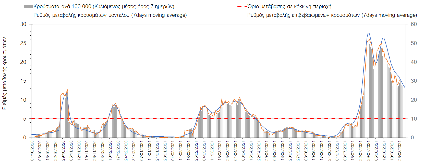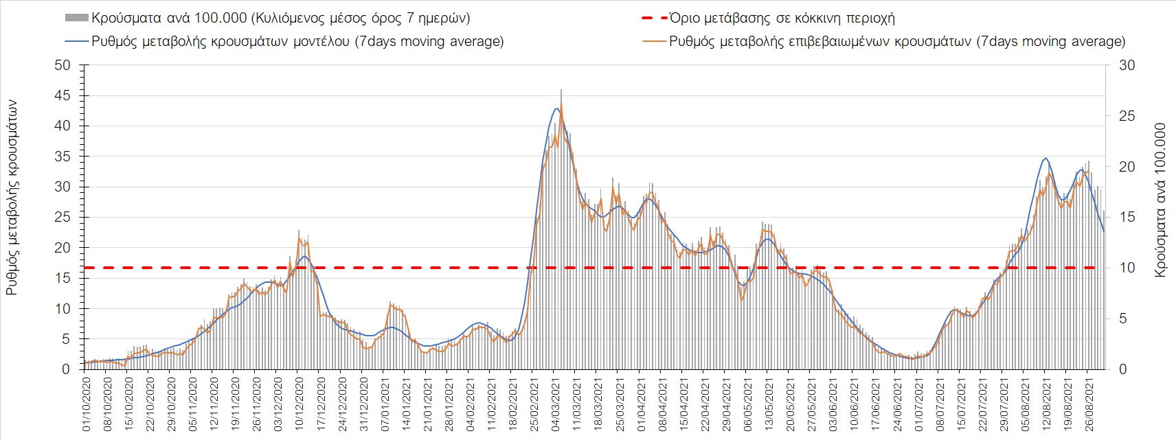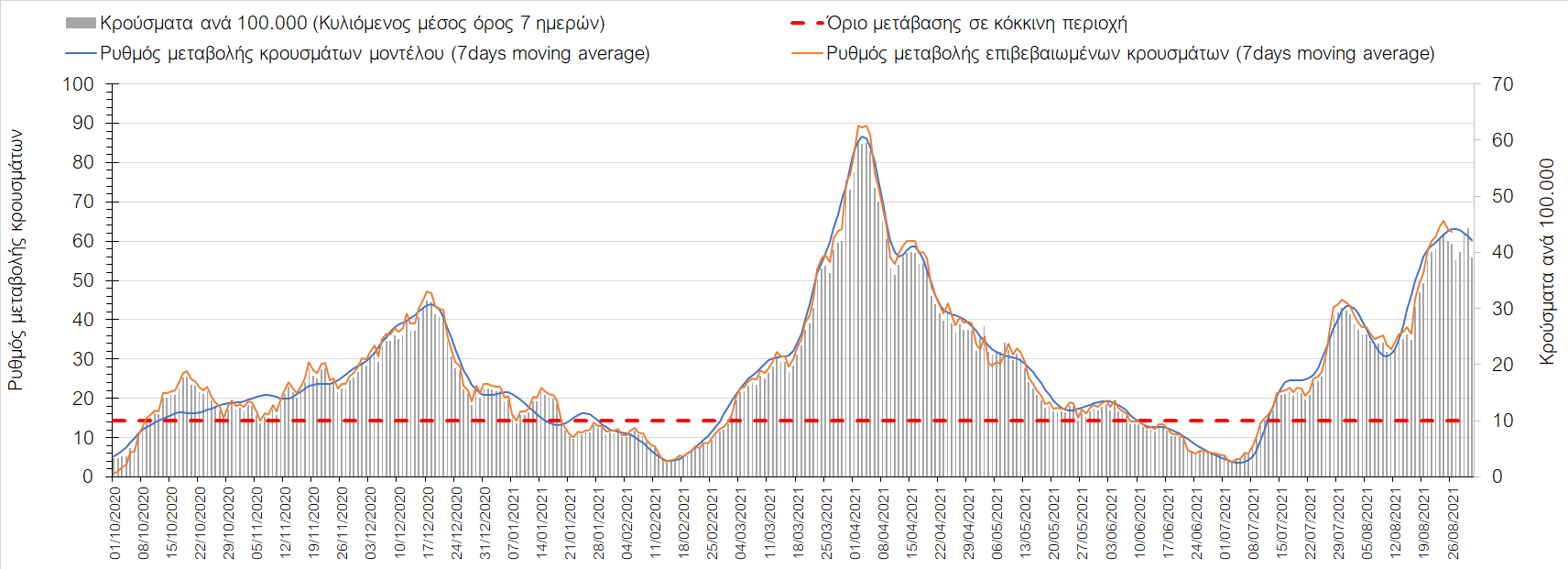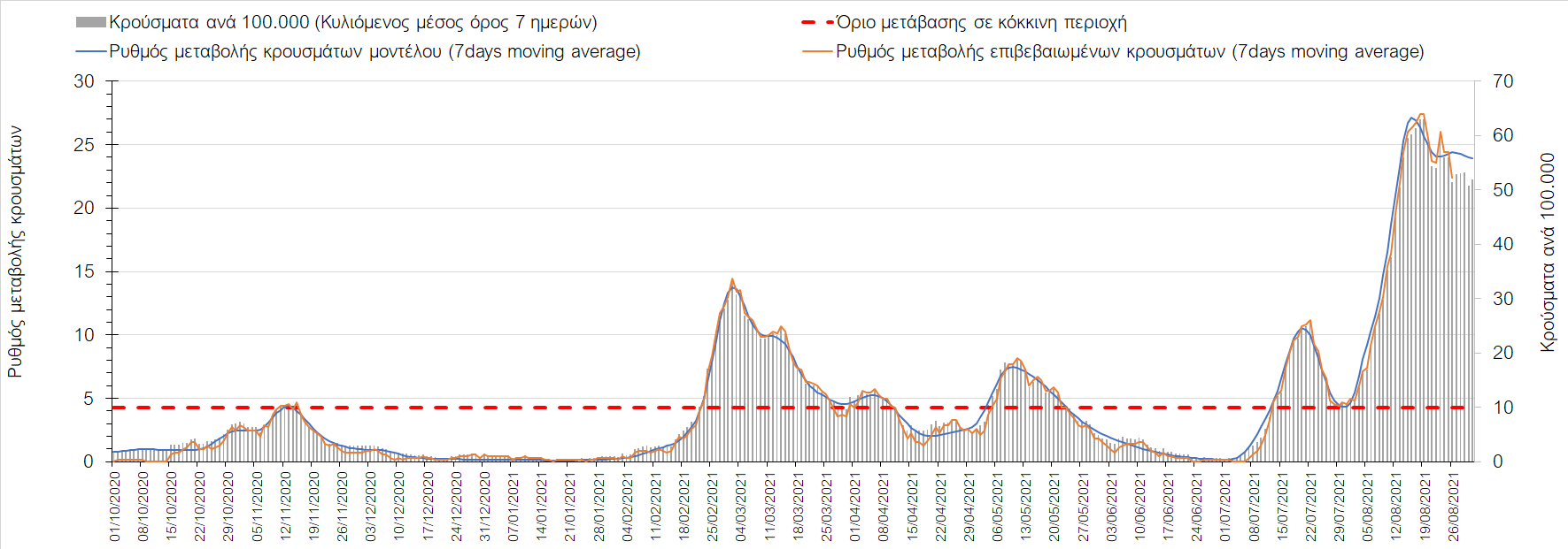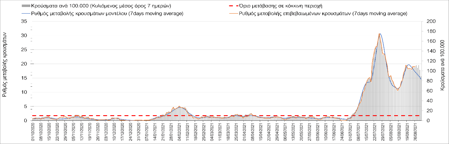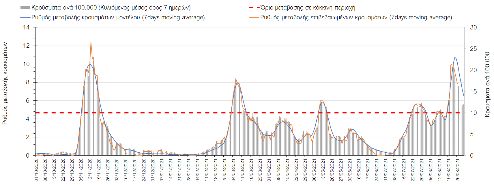 Από την αρχή του Ιουλίου παρατηρείται μια αύξηση του αριθμού των κρουσμάτων στην Αθήνα, η οποία δεν συνάδει ούτε με τη διαμόρφωση της μεταδοτικότητας από τη θερμοκρασία, αλλά ούτε και με τα υπάρχοντα μέτρα, και η οποία την έχει φέρει πέρα από το όριο της περιοχής ανησυχίας. Μια πιθανή εξήγηση είναι η αυξημένη διασπορά στην κοινότητα των μεταλλαγμένων στελεχών Β.1.1.318 και Β.1.167, οπότε και αναμένουμε τα δεδομένα των επομένων ημερών για να μπορέσουμε να διαμορφώσουμε μια πιο σαφή εικόνα.