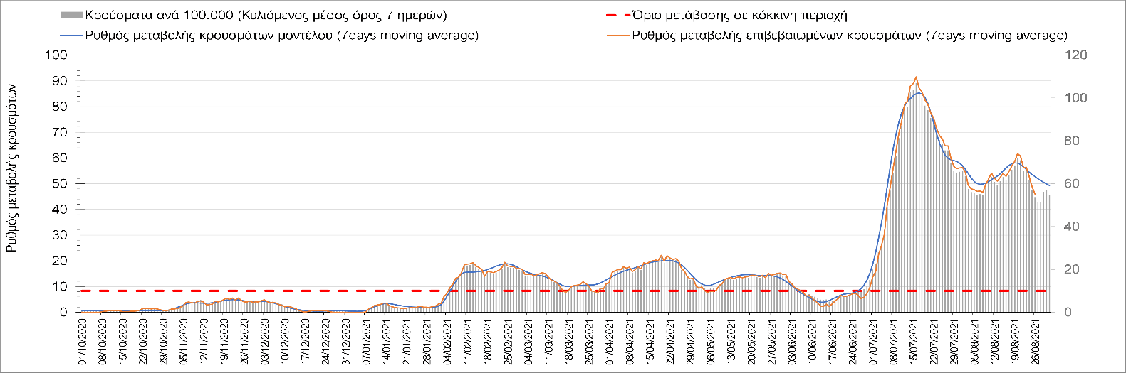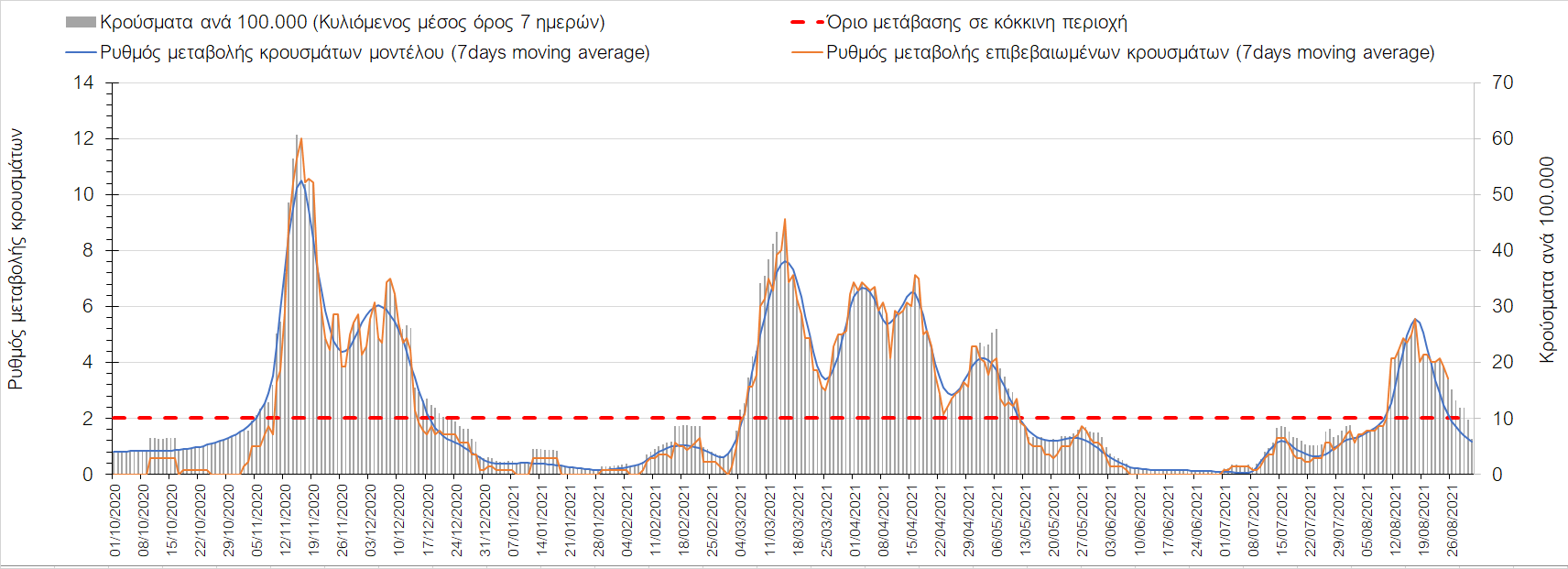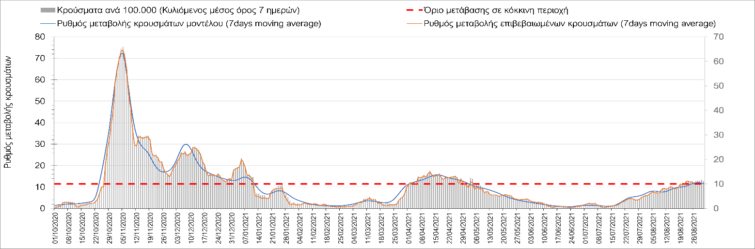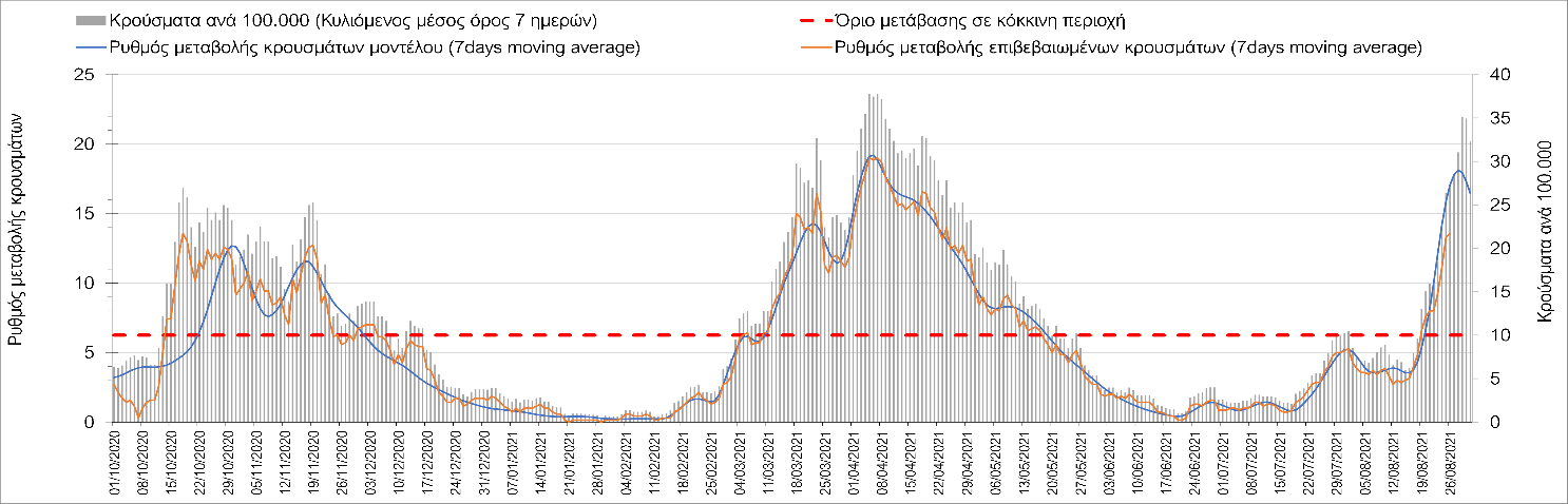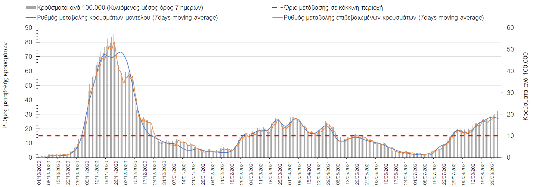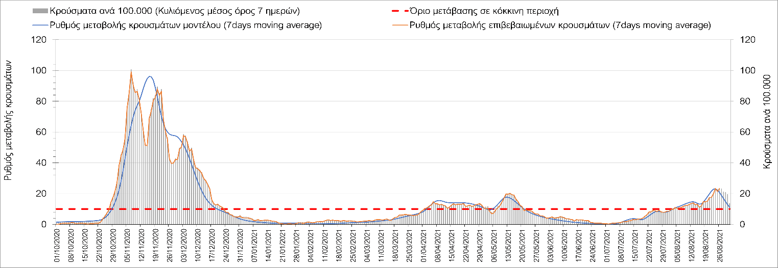 Από την αρχή του Ιουλίου παρατηρείται μια αύξηση του αριθμού των κρουσμάτων στην Αθήνα, η οποία δεν συνάδει ούτε με τη διαμόρφωση της μεταδοτικότητας από τη θερμοκρασία, αλλά ούτε και με τα υπάρχοντα μέτρα, και η οποία την έχει φέρει πέρα από το όριο της περιοχής ανησυχίας. Μια πιθανή εξήγηση είναι η αυξημένη διασπορά στην κοινότητα των μεταλλαγμένων στελεχών Β.1.1.318 και Β.1.167, οπότε και αναμένουμε τα δεδομένα των επομένων ημερών για να μπορέσουμε να διαμορφώσουμε μια πιο σαφή εικόνα.