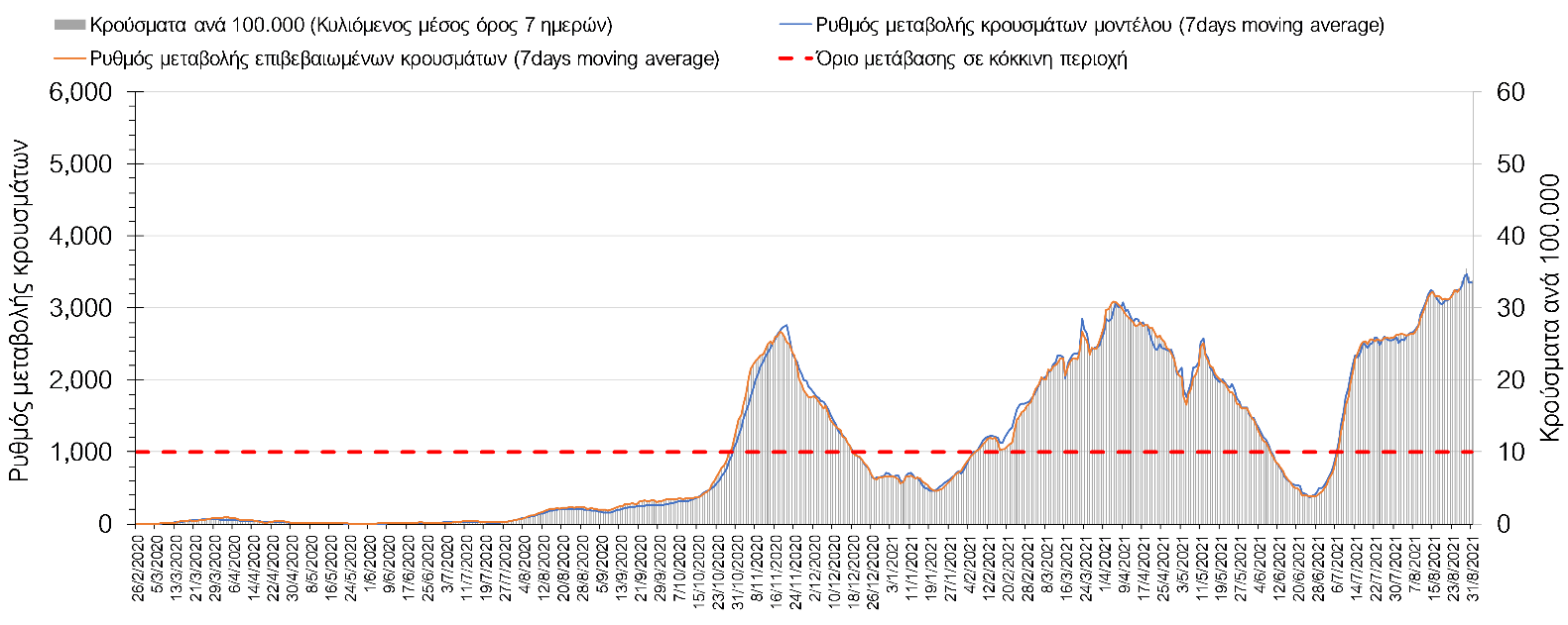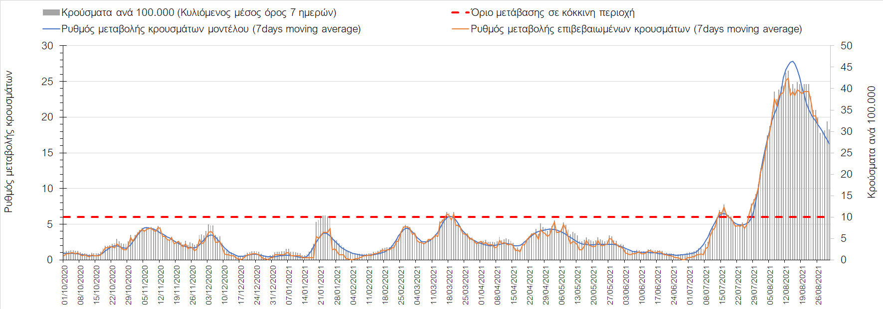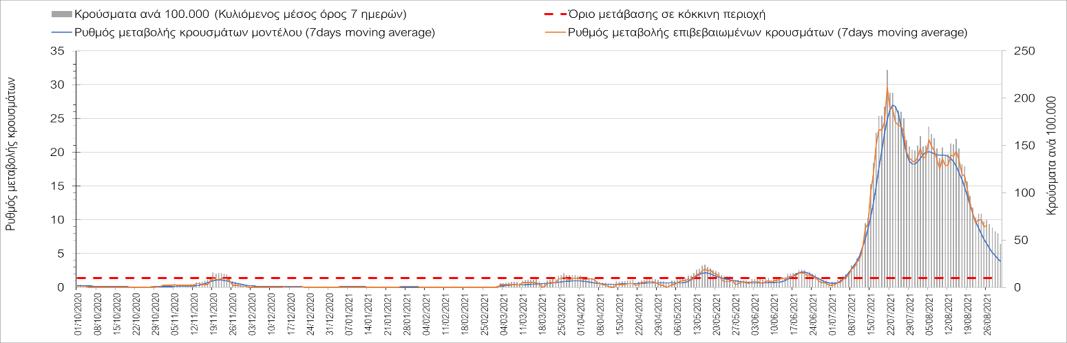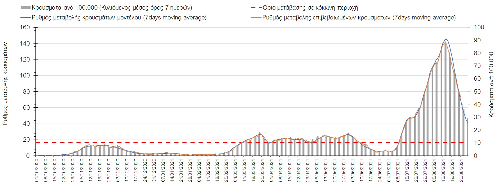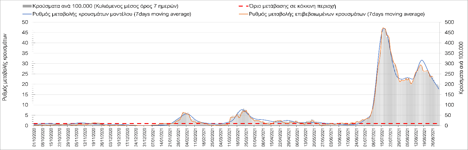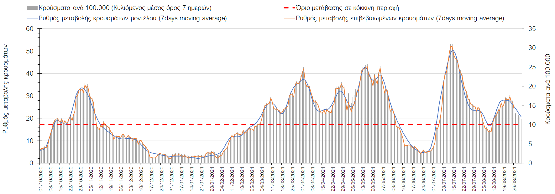 Από την αρχή του Ιουλίου παρατηρείται μια αύξηση του αριθμού των κρουσμάτων στην Αθήνα, η οποία δεν συνάδει ούτε με τη διαμόρφωση της μεταδοτικότητας από τη θερμοκρασία, αλλά ούτε και με τα υπάρχοντα μέτρα, και η οποία την έχει φέρει πέρα από το όριο της περιοχής ανησυχίας. Μια πιθανή εξήγηση είναι η αυξημένη διασπορά στην κοινότητα των μεταλλαγμένων στελεχών Β.1.1.318 και Β.1.167, οπότε και αναμένουμε τα δεδομένα των επομένων ημερών για να μπορέσουμε να διαμορφώσουμε μια πιο σαφή εικόνα.