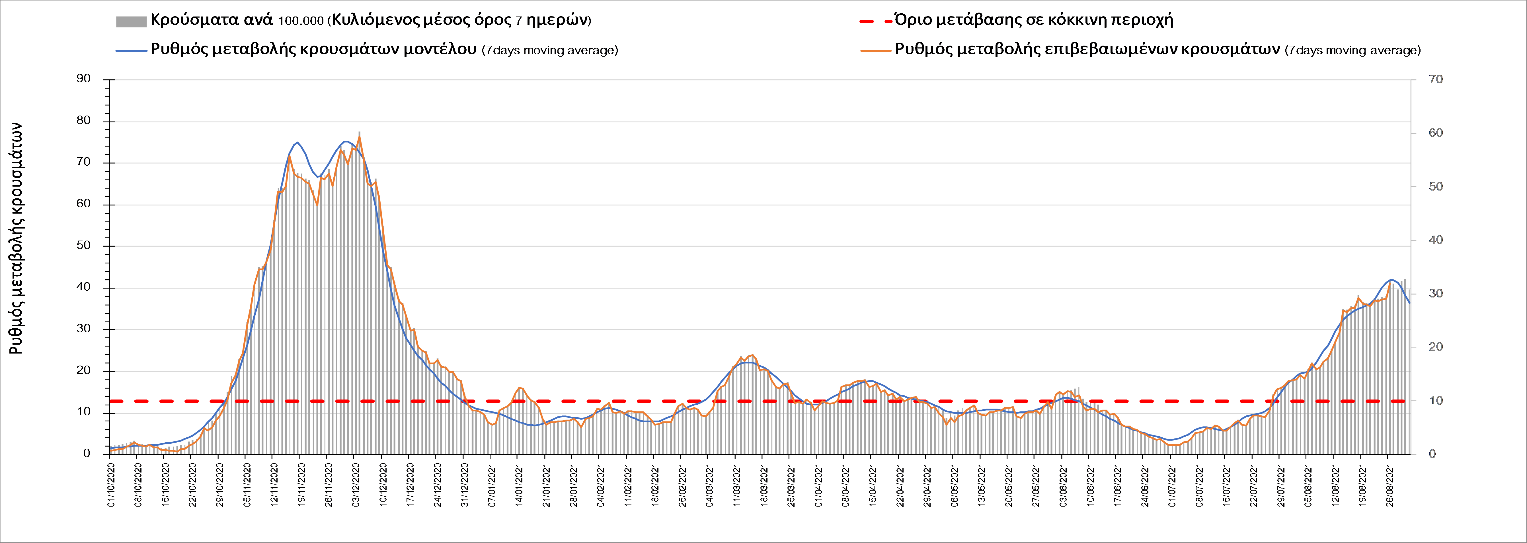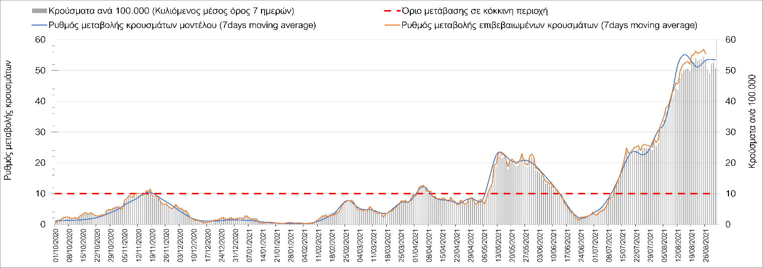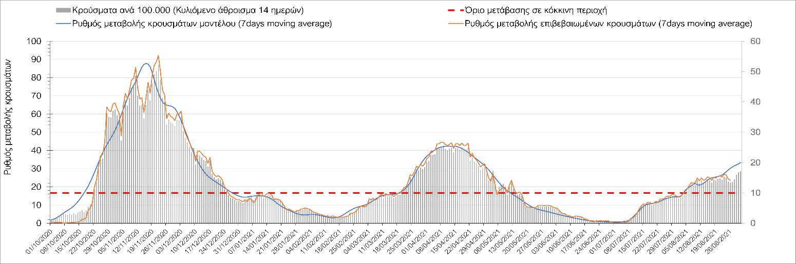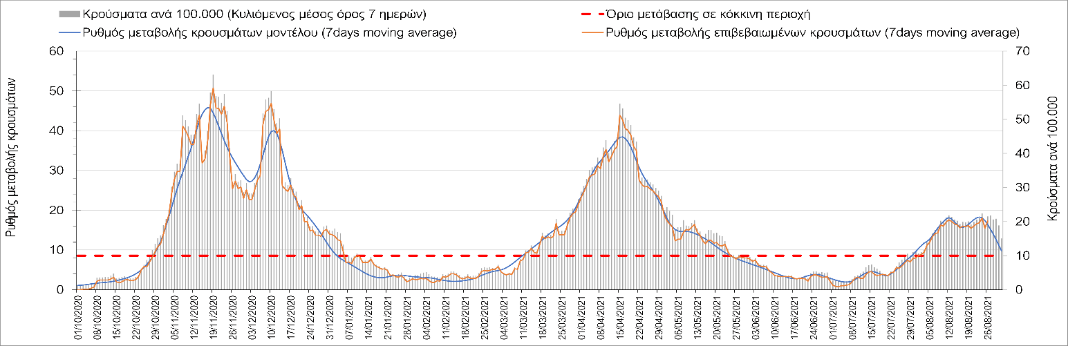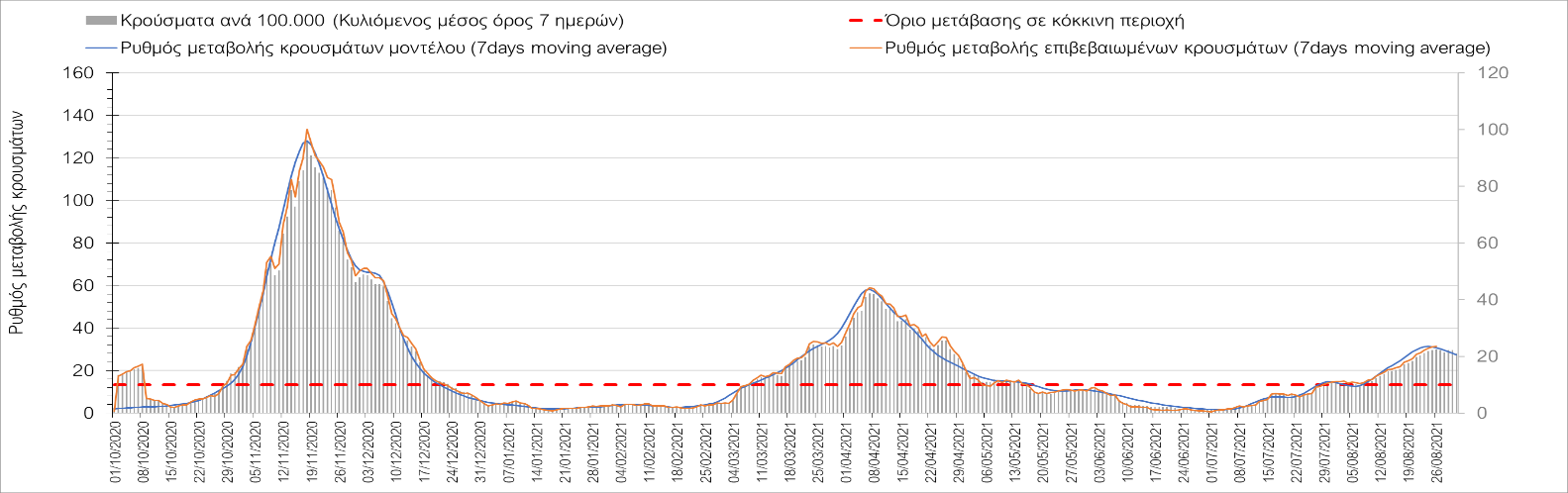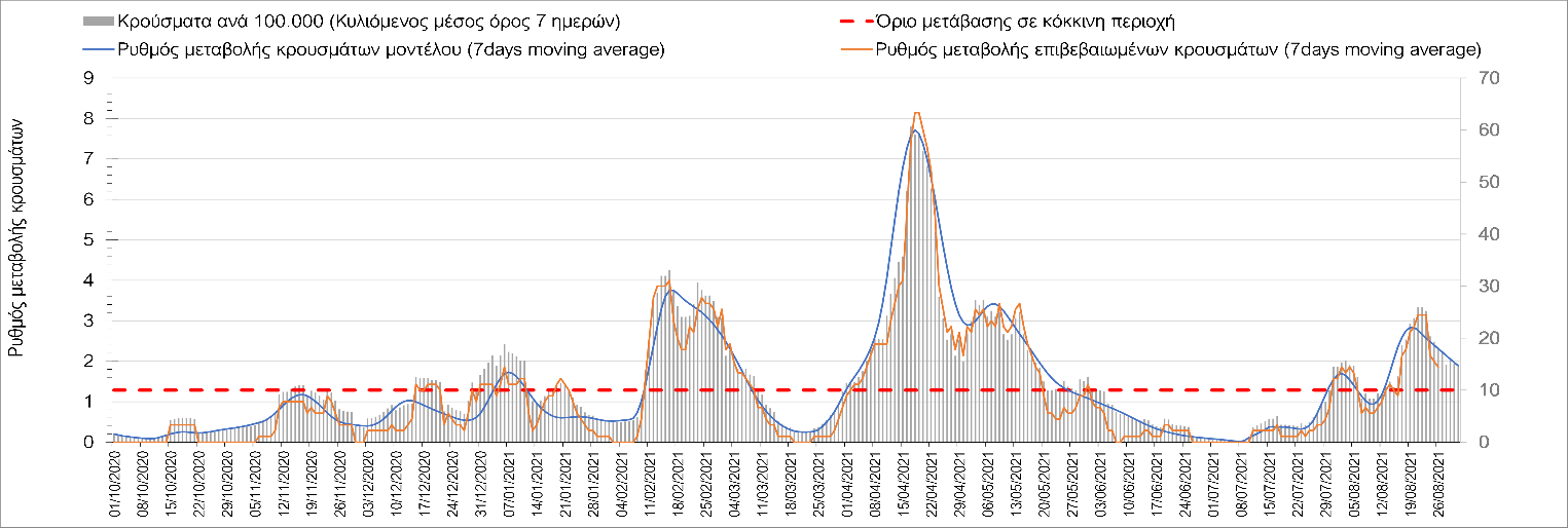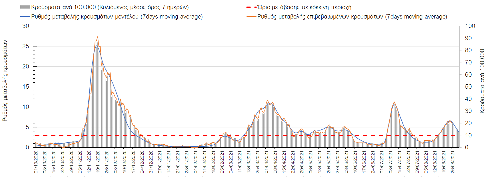 Από την αρχή του Ιουλίου παρατηρείται μια αύξηση του αριθμού των κρουσμάτων στην Αθήνα, η οποία δεν συνάδει ούτε με τη διαμόρφωση της μεταδοτικότητας από τη θερμοκρασία, αλλά ούτε και με τα υπάρχοντα μέτρα, και η οποία την έχει φέρει πέρα από το όριο της περιοχής ανησυχίας. Μια πιθανή εξήγηση είναι η αυξημένη διασπορά στην κοινότητα των μεταλλαγμένων στελεχών Β.1.1.318 και Β.1.167, οπότε και αναμένουμε τα δεδομένα των επομένων ημερών για να μπορέσουμε να διαμορφώσουμε μια πιο σαφή εικόνα.