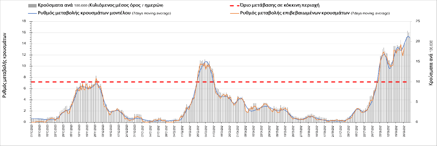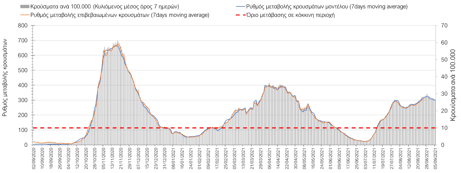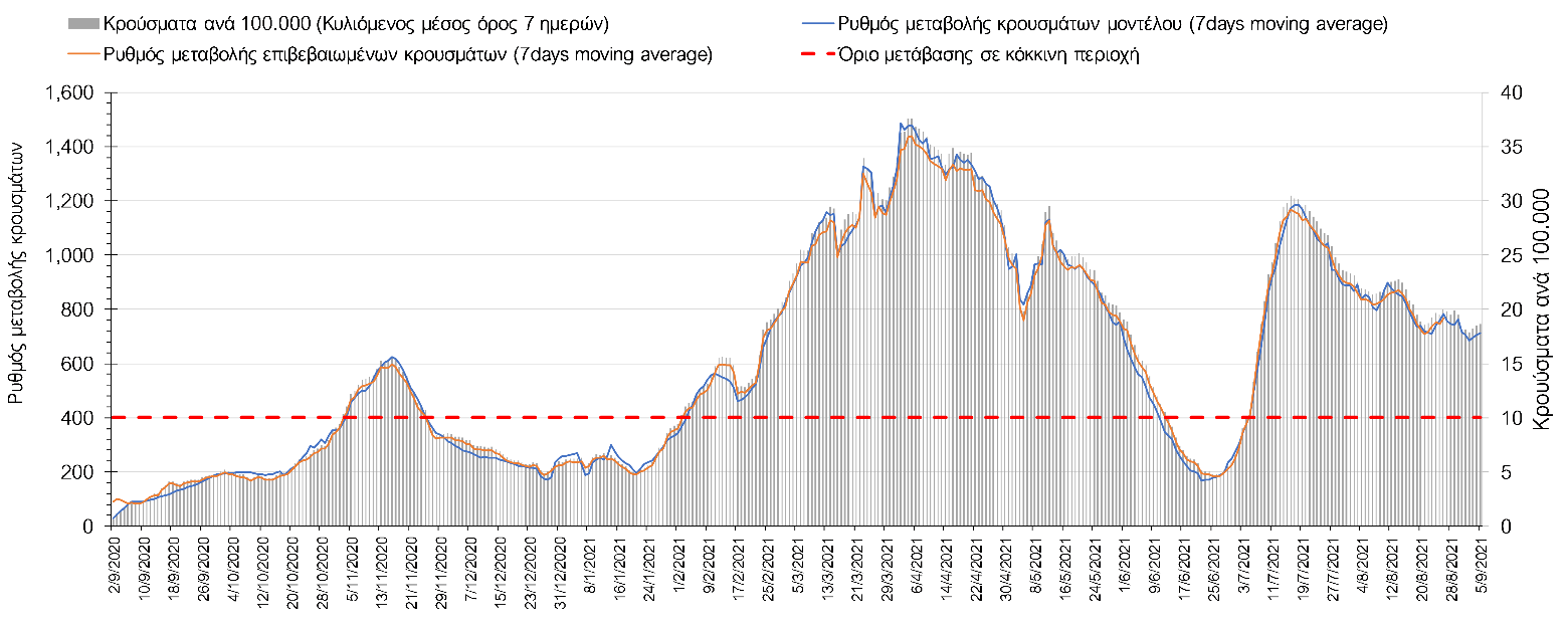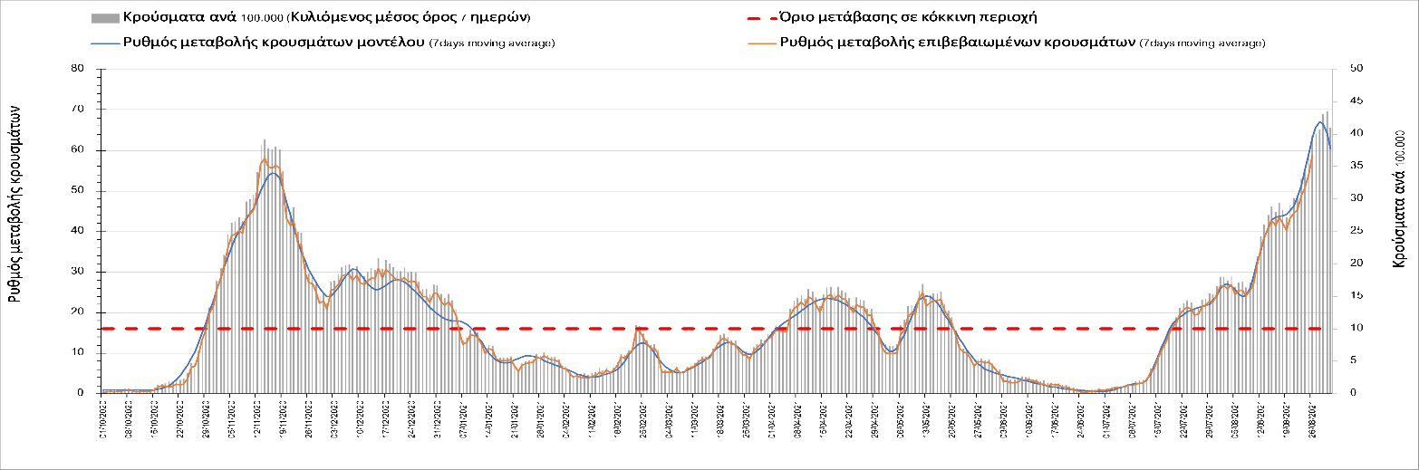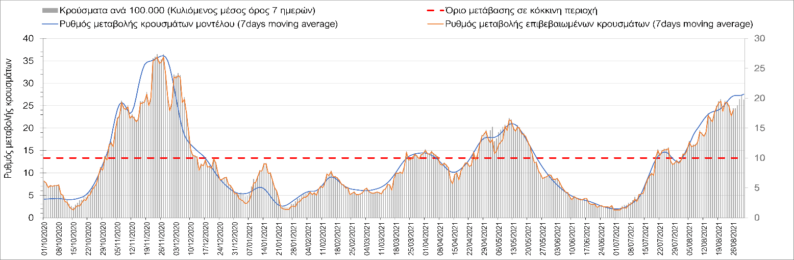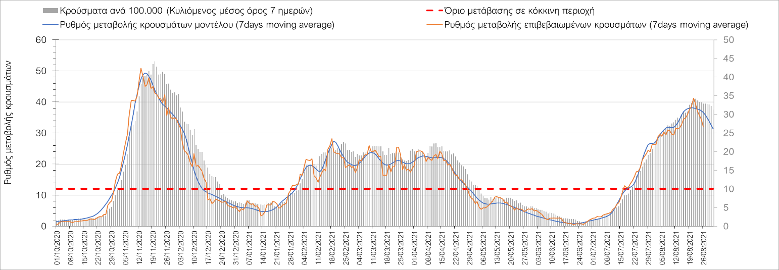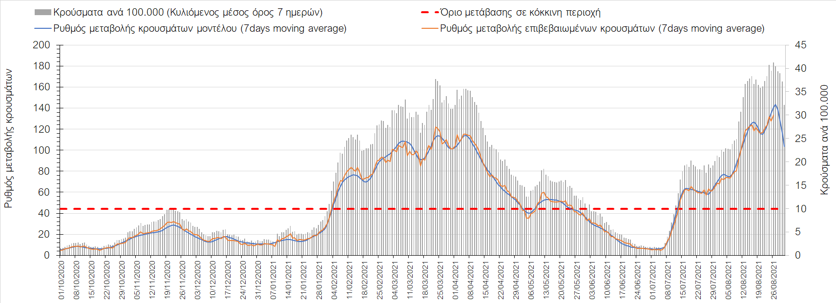 Από την αρχή του Ιουλίου παρατηρείται μια αύξηση του αριθμού των κρουσμάτων στην Αθήνα, η οποία δεν συνάδει ούτε με τη διαμόρφωση της μεταδοτικότητας από τη θερμοκρασία, αλλά ούτε και με τα υπάρχοντα μέτρα, και η οποία την έχει φέρει πέρα από το όριο της περιοχής ανησυχίας. Μια πιθανή εξήγηση είναι η αυξημένη διασπορά στην κοινότητα των μεταλλαγμένων στελεχών Β.1.1.318 και Β.1.167, οπότε και αναμένουμε τα δεδομένα των επομένων ημερών για να μπορέσουμε να διαμορφώσουμε μια πιο σαφή εικόνα.