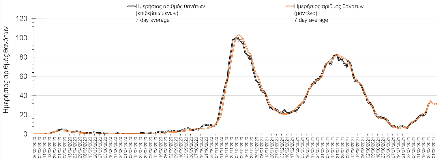Σχήμα 3. Αριθμός θανάτων (κυλιόμενος μέσος όρος 7 ημερών) σύμφωνα με τα στοιχεία του ΕΟΔΥ και τις προβλέψεις της υπολογιστικής πλατφόρμας CORE.