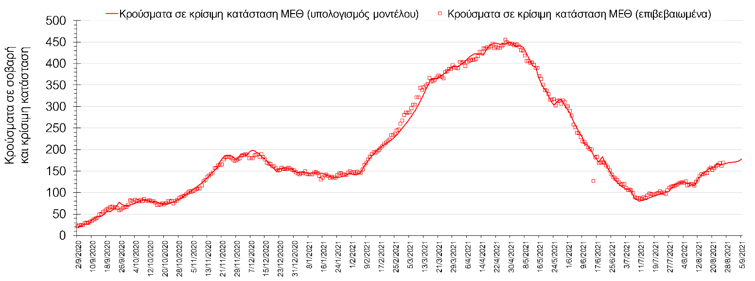 Αντίθετα στη Θεσσαλονίκη η πολύ έντονα αυξητική πορεία ενώ παρουσίαζε σταθεροποιητικές τάσεις, εμφανίζεται ξανά ελαφρά ανοδική (Σχήμα 7), ενώ η πορεία των κρουσμάτων σε κρίσιμη κατάσταση (διασωληνωμένοι σε ΜΕΘ) στη Θεσσαλονίκη ακολουθεί πλήρως τις προβλέψεις του μοντέλου και παρουσιάζεται στο Σχήμα 8.