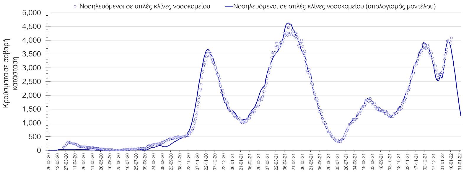 Η πορεία της μέσης εβδομαδιαίας τιμής των κρουσμάτων, καθώς και του κυλιόμενου μέσου όρου 7 ημερών του αριθμού των κρουσμάτων ανά 100.000 πληθυσμού, όπως έχουν καταγραφεί από τον ΕΟΔΥ και η αναμενόμενη πορεία τους όπως προδιαγράφεται από την υπολογιστική πλατφόρμα CORE για την Ελληνική επικράτεια μέχρι τις 31 Ιανουαρίου, αποτυπώνονται στο Σχήμα 4. Αυτή η προβλεπόμενη πορεία, που αφορά τα κρούσματα, τους νοσηλευόμενους σε απλές κλίνες, όσο και σε ΜΕΘ, καθώς επίσης και τους θανάτους, βασίζεται στις ακόλουθες παραδοχές: