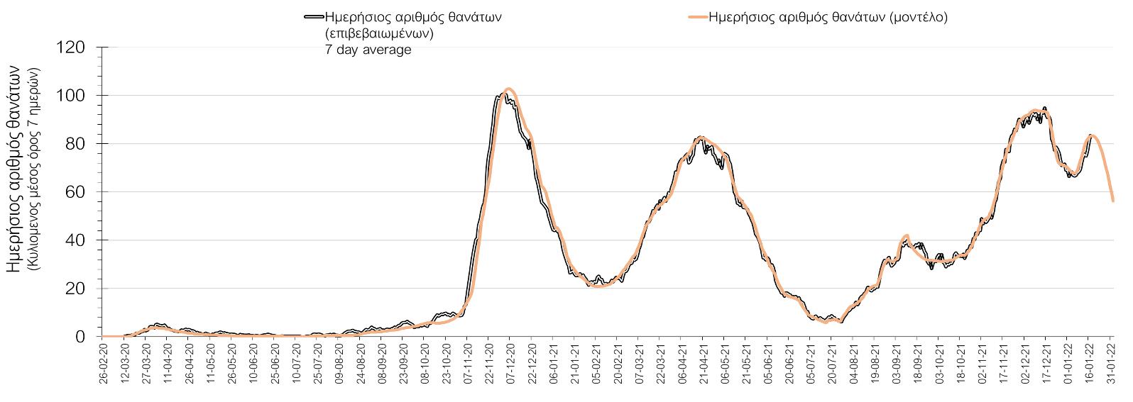 Ο αριθμός ημερήσιων θανάτων (101) που καταγράφηκε είναι αυξημένος σε σχέση με την Κυριακή (95). Όπως είχαμε προβλέψει ο κυλιόμενος εβδομαδιαίος μέσος όρος που σήμερα είναι 83,3 ακολουθεί πλέον την πορεία του αριθμού των ασθενών σε κρίσιμη κατάσταση.