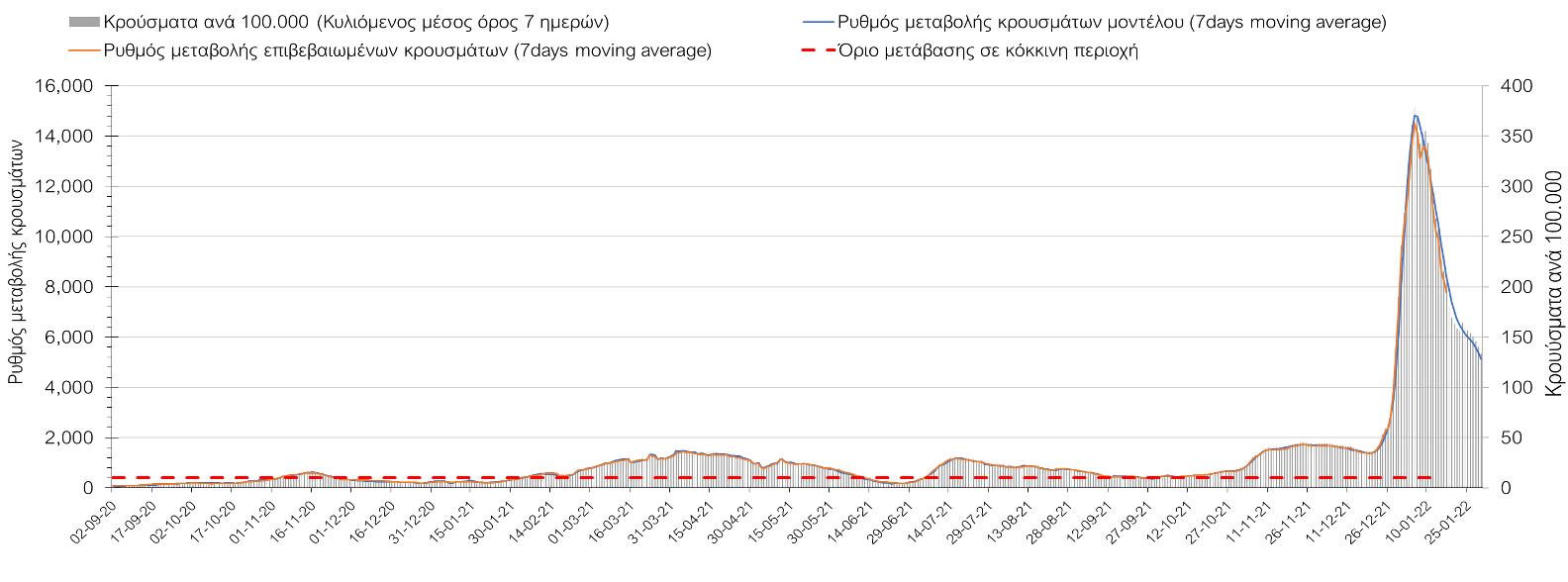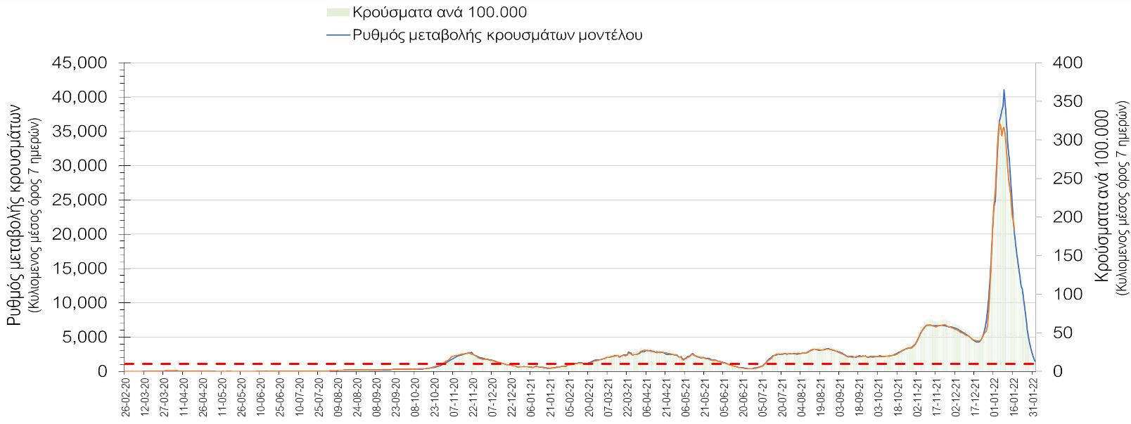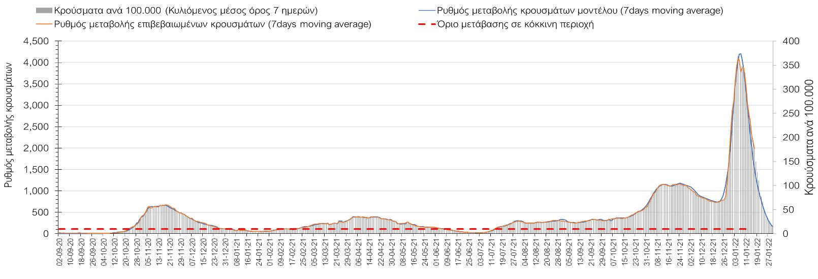 Η ανοδική τάση που είχε διαμορφωθεί από τις 23/12 και που οφείλεται στην μετάλλαξη Ο, έχει περιέλθει σε πτωτική, και αντικατοπτρίζεται στον ημερήσιο αριθμό των κρουσμάτων (κυλιόμενος μέσος όρος 7 ημερών), ο οποίος βρίσκεται κάτω από τις 21.000 (20.598). Αυτή αποτυπώνεται πλέον σε όλες σχεδόν τις περιοχές, πράγμα που σημαίνει ότι τα μέτρα που εφαρμοστήκαν στις 24 και 29/12 συντέλεσαν στον περιορισμό του ρυθμού ανόδου, ενώ, πέρα από την εφαρμογή των μέτρων, και από το ποσοστό εμβολιασμού (και μάλιστα με 3η δόση), έχει αυξηθεί πιο σημαντικά από το αναμενόμενο το ποσοστό φυσικής ανοσίας, λόγω του μεγάλου αριθμού ασυμπτωματικών που νόσησαν από το στέλεχος Ο. Πέρα από την εφαρμογή των μέτρων (σε συνδυασμό με την σημαντική συνειδητοποίηση εκ μέρους του πληθυσμού ότι χρειάζεται προσοχή και σύνεση για την αντιμετώπιση της διασποράς της παραλλαγής Ο), η συστηματική αποκλιμάκωση της πανδημίας (της οποίας η έναρξη όπως ήδη βλέπουμε να τοποθετείται σε διαφορετικό χρονικό σημείο ανά περιοχή) θα οφείλεται στο συνδυασμό των επιπέδων ανοσίας του πληθυσμού (επίκτητη και φυσική), αλλά και στον πολύ μεγάλο αριθμό των τεστ συνολικά (μοριακά, rapid και self-test) που πραγματοποιούνται καθημερινά, των οποίων ο αριθμός έχει φθάσει σε ημερήσια βάση τις 700.000.