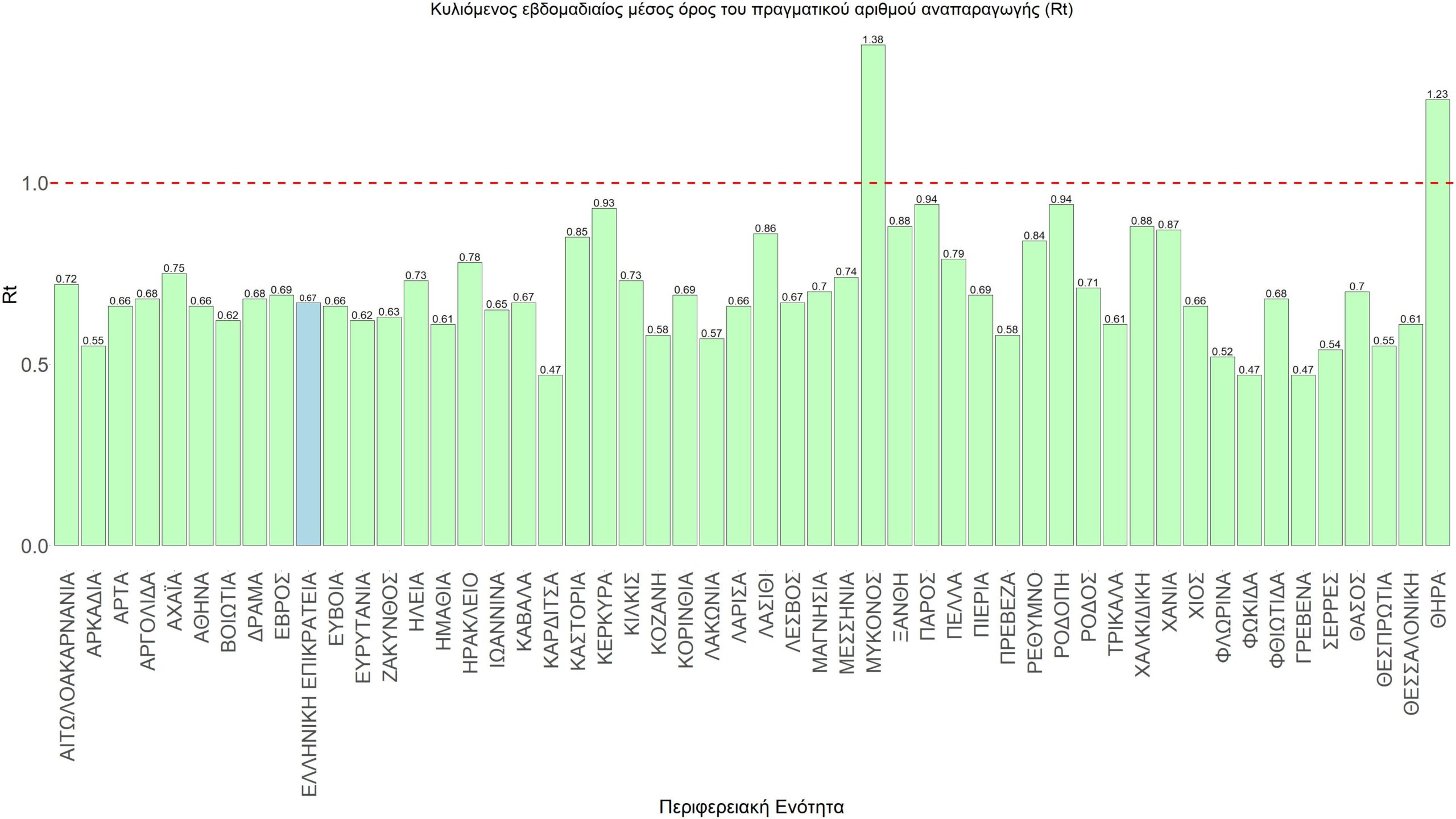 O πραγματικός αριθμός αναπαραγωγής Rt ανά περιφερειακή ενότητα της χώρας παρουσιάζεται στο Σχήμα 58.