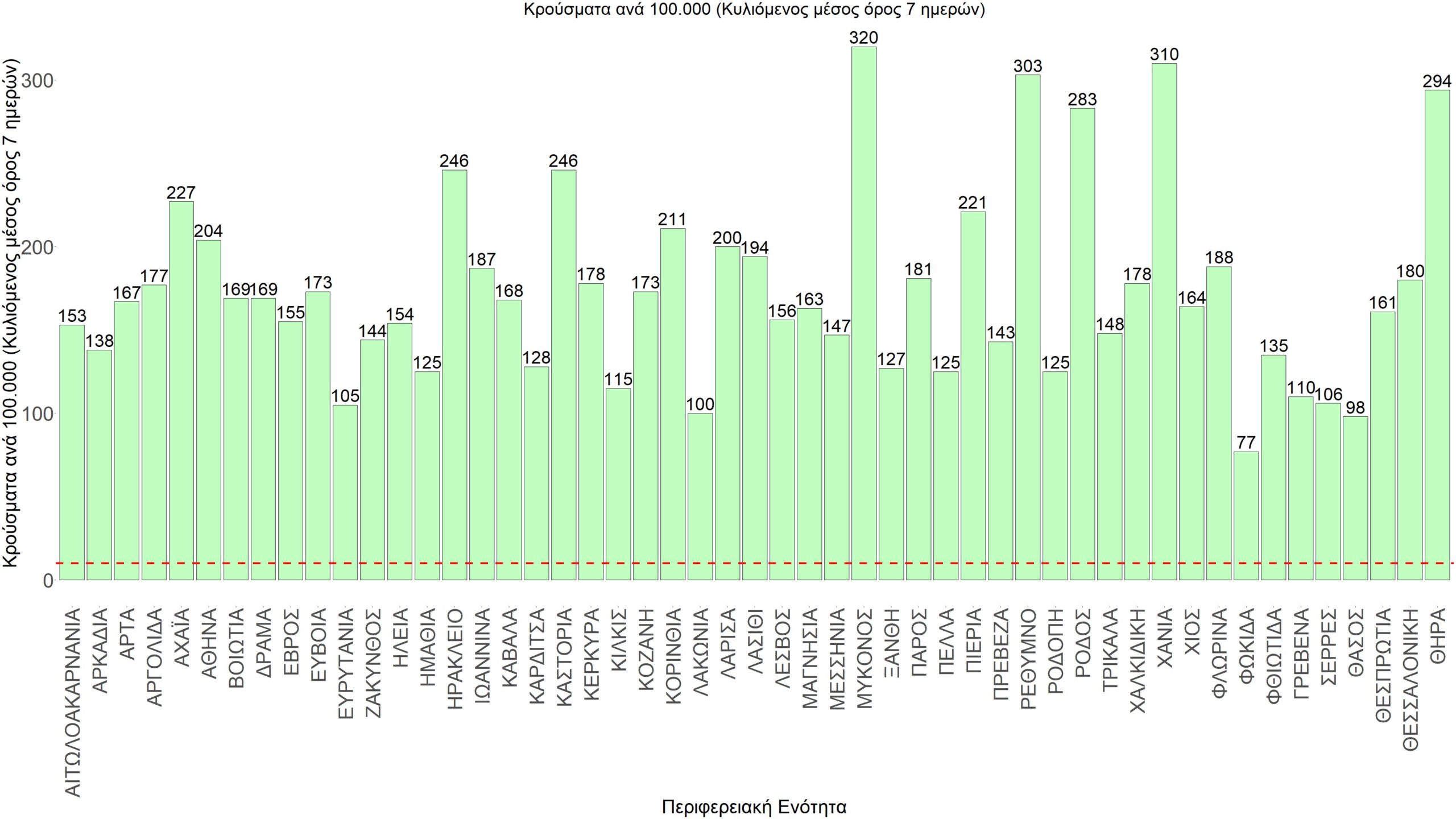 Σχήμα 60. Συγκεντρωτική εικόνα των νέων κρουσμάτων ανά 100.000 κατοίκους (κυλιόμενος μέσος όρος 7 ημερών) των επιμέρους περιοχών