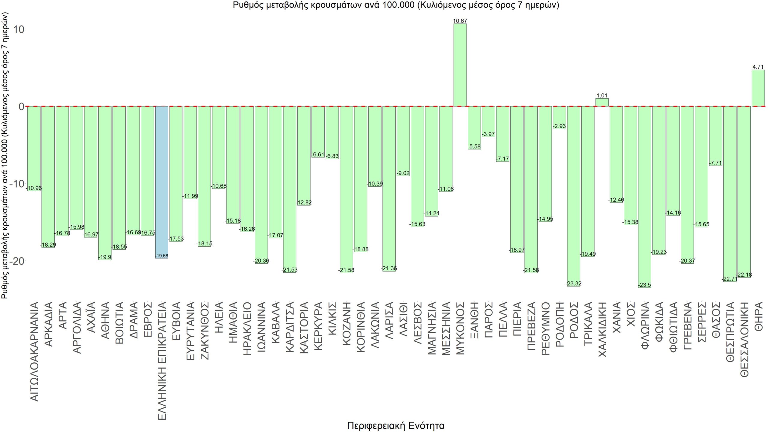 Η αποτύπωση των τάσεων στις επιμέρους περιοχές, παρουσιάζεται στο Σχήμα 61, όπου παρουσιάζεται ο ρυθμός μεταβολής των νέων κρουσμάτων ανά 100.000 κατοίκους (κυλιόμενος μέσος όρος 7 ημερών) των επιμέρους περιοχών. Θετικές τιμές του ρυθμού μεταβολής υποδηλώνουν άνοδο, ενώ αρνητικές τιμές υποδηλώνουν πτωτική πορεία. Το σχήμα αυτό είναι ιδιαίτερα κατατοπιστικό, γιατί οι τιμές που παρουσιάζονται είναι κανονικοποιημένες ως προς τον πληθυσμό, και η σύγκριση των τάσεων ανάμεσα στις επιμέρους περιοχές είναι άμεση.