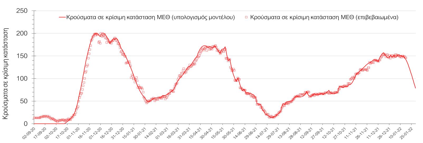 Με βάση τα χθεσινά αποτελέσματα, σε σχέση με την Κυριακή, έχουμε μικρότερο αριθμό ασθενών σε κρίσιμη κατάσταση (διασωληνωμένοι σε ΜΕΘ), αλλά σημαντικά μεγαλύτερο αριθμό θανάτων από COVID-19. Σε πανελλαδικό επίπεδο ο κυλιόμενος εβδομαδιαίος μέσος όρος του δείκτη θετικότητας διαμορφώθηκε στο 6,9% (η ημερήσια τιμή τη Δευτέρα είναι 14,9%) ενώ ο κυλιόμενος εβδομαδιαίος μέσος όρος του πραγματικού αριθμού αναπαραγωγής Rt (δηλαδή ο αριθμός των ατόμων που ένας φορέας μπορεί να επιμολύνει) μειώθηκε ελαφρά στο 0,67 (Rt κάτω από τη μονάδα υποδηλώνει καθαρή μείωση της διασποράς του ιού στην κοινότητα). Στις 23/12/21 ξεκίνησε και επίσημα το 5ο κύμα της πανδημίας στην Ελλάδα λόγω της ταχείας διασποράς του στελέχους Ο του SARS-CoV-2 η οποία εκτιμάται από τα σχετικά δεδομένα ότι πλέον έχει ξεπεράσει το 95% των νέων κρουσμάτων. Εντούτοις, την τελευταία εβδομάδα βρισκόμαστε σε σαφή φάση ύφεσης του 5ου κύματος της πανδημίας.