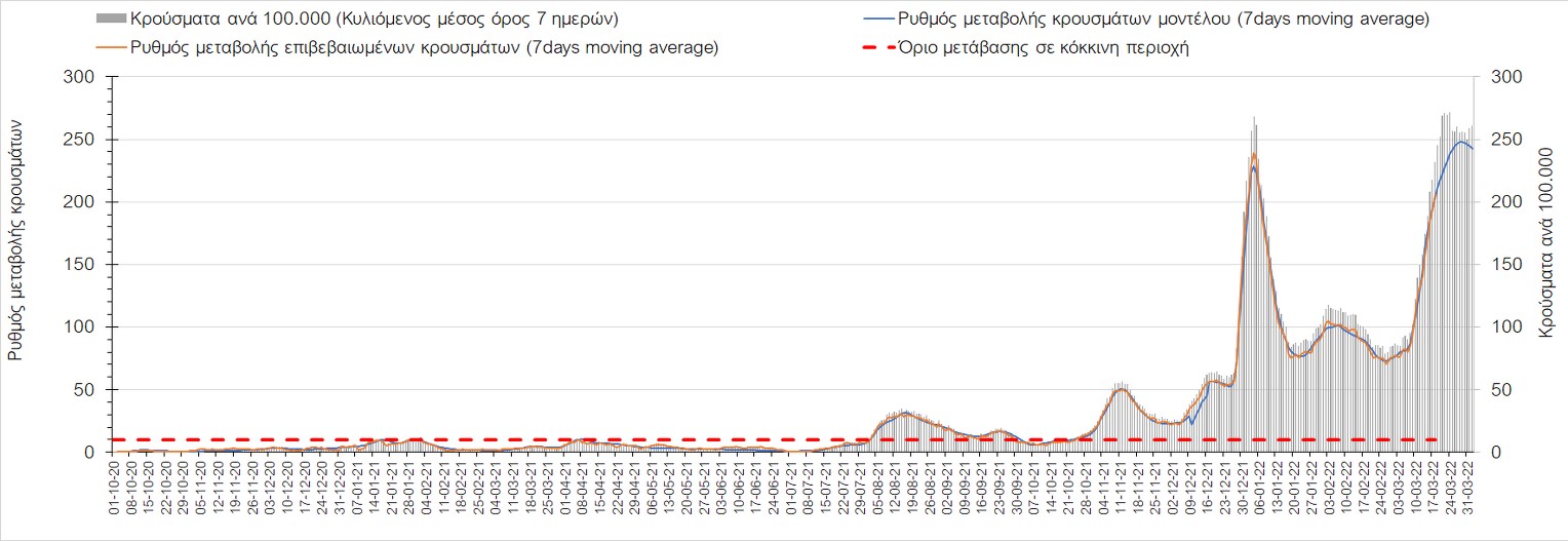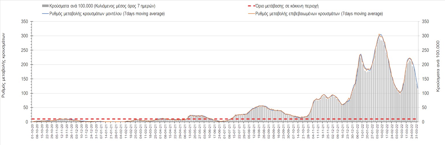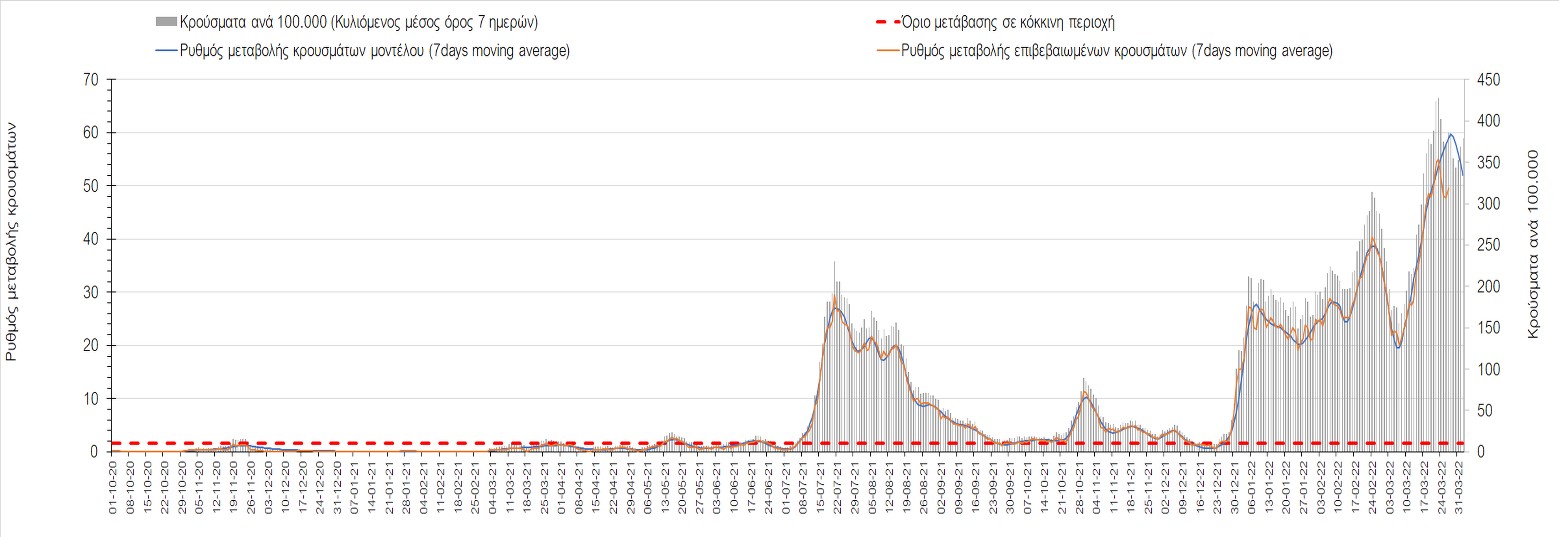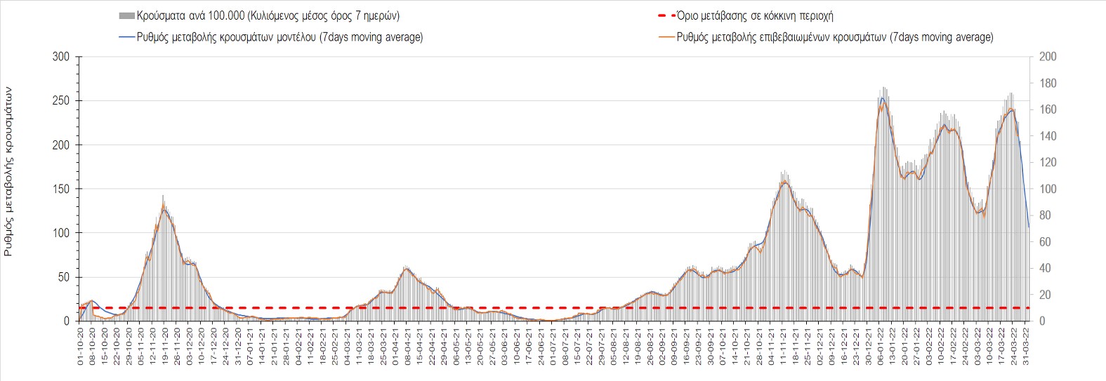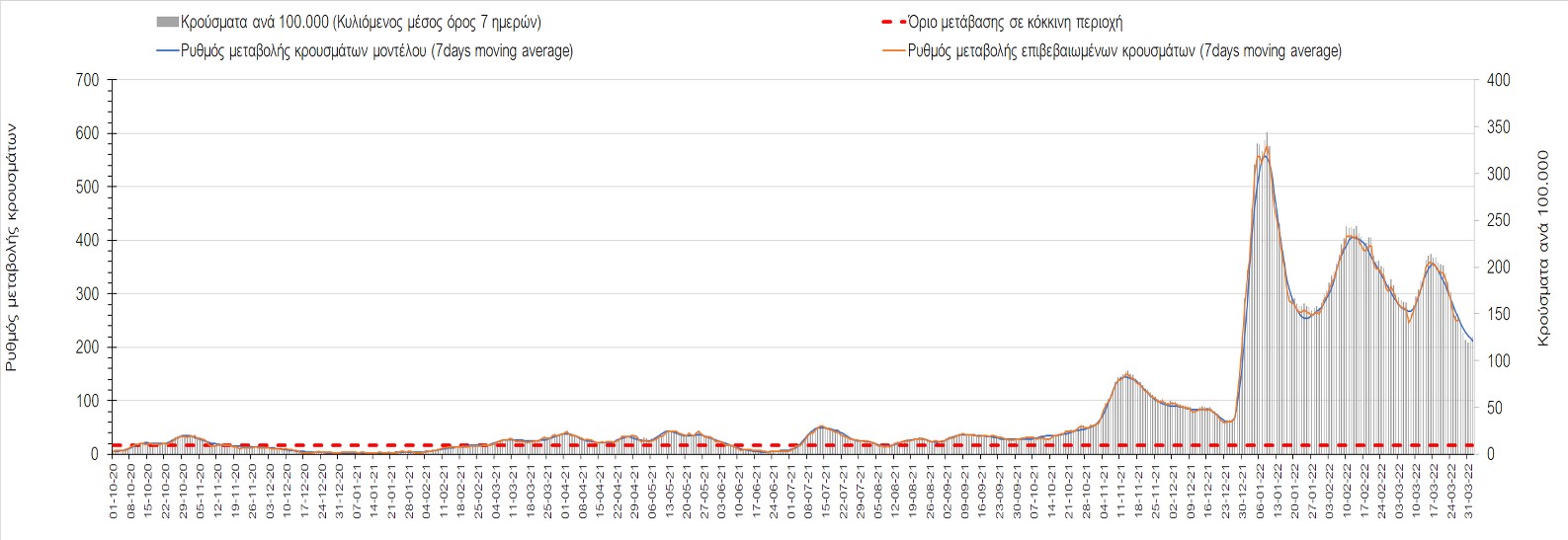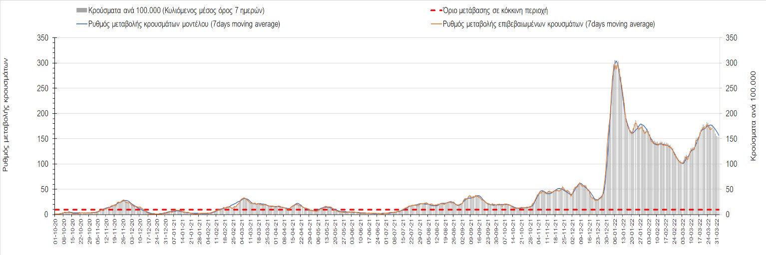 Πλέον παρατηρείται κάμψητηςανοδικήςπορείαςπου αντικατοπτρίζεται και στον ημερήσιο αριθμό των κρουσμάτων (κυλιόμενος μέσος όρος 7 ημερών), ο οποίοςαν και σήμερα εμφανίζει οριακή άνοδο, βρίσκεται μόλις πάνω από τις20.000 (20.250).Για να επανέλθει η συστηματική αποκλιμάκωση της πανδημίας, πέρα από την εφαρμογή των μέτρων (σε συνδυασμό με την σημαντική συνειδητοποίηση εκ μέρους του πληθυσμού ότι χρειάζεται προσοχή και σύνεση για την αντιμετώπιση της διασποράς της παραλλαγής Ο), θα πρέπει να στοχεύσουμε στη διατήρηση και την επέκταση της επίκτητης ανοσίας του πληθυσμού, αλλά και στον πολύ μεγάλο αριθμό των τεστ συνολικά (μοριακά, rapid και self-test) που πραγματοποιούνται καθημερινά, των οποίων ο αριθμός έχει φθάσει σε ημερήσια βάση τις 700.000. Για αυτό το λόγο και με δεδομένη τη μεγάλη διασπορά στα σχολεία θεωρούμε πρόωρη τη μείωση των self-test στα παιδιά σχολικής ηλικίας σε ένα μόνο την εβδομάδα από τα δύο που γίνονταν μέχρι τώρα.